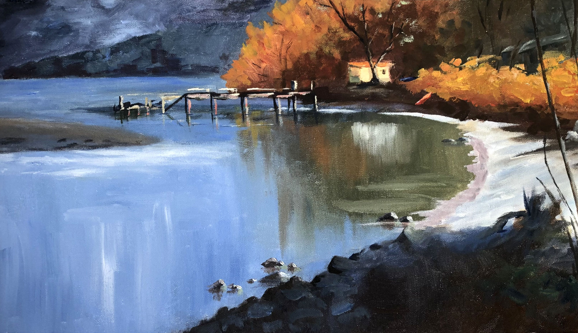3. Use contrast to direct the eye. The jetty is the star of the show in this painting, so highlighting it more against the dark background makes sense to make it stand out.