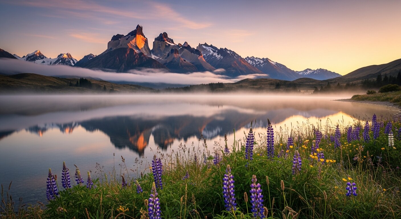 Within moments, PaintyBot generated this stunning reference image. Look at that light! The mist sitting low across the water, the warm glow on those peaks, and those lupins in the foreground giving us a beautiful colour accent.