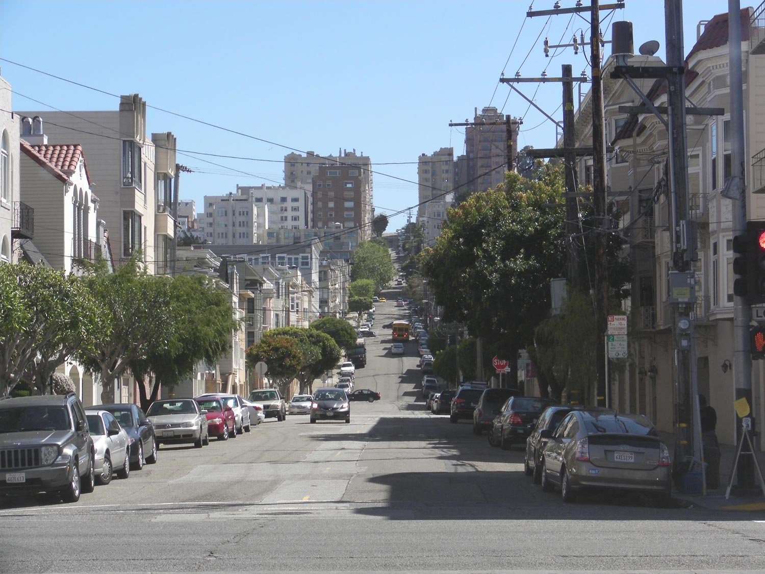 Hi Karen, you've done a great job of the soft atmospheric perspective in the background, being careful to avoid and dark values that would have spoiled the illusion of depth. You're drawing is solid too, with the perspective of the street well handled, though the cars could do with a little tweaking, namely making them bigger, and the cablecar as well. Wonderful work overall—this is a tricky subject, and you've done a great job capturing its charm! Keep it up!