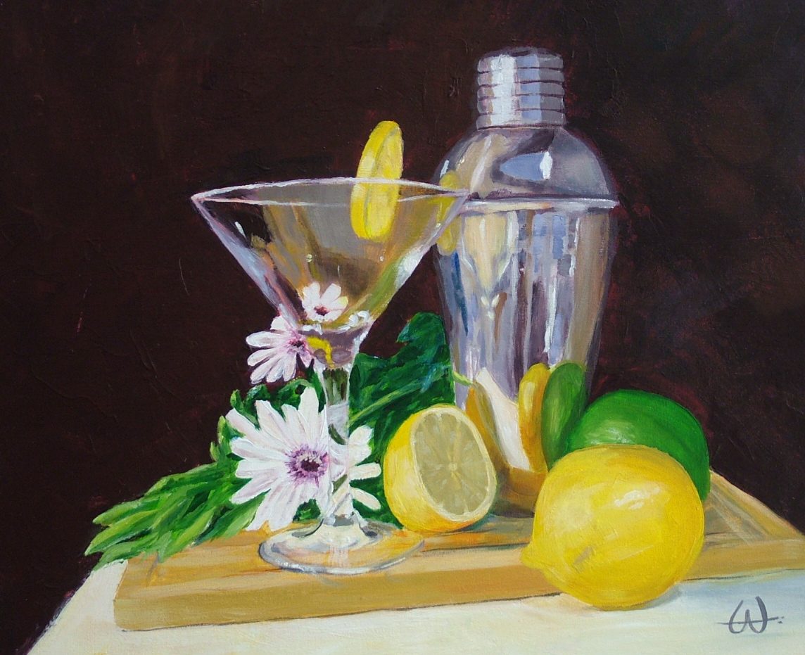 Design Nice design Anne - as much as I try to avoid using the 'nice' word, there it is. It's well balanced, yet not symmetrical, it has a good variety of shapes, sizes and placements which don't seem over-organised, which is our natural tendency. I usually avoid a flat black background but in this case I think it works well with the modern items you have used. Even the slightly off balance chopping board and sharp diagonals running off the edges seem to me to add to the contemporary feel of this painting. I especially like the subtle curving procession from whole lemon to half lemon to slice which leads us to the top of the cocktail shaker - very cool. Colour I find it interesting that most of these still life paintings end up looking cooler (more blue) than their counterpart photos. I guess that's one of the differences between our eyes and a camera - our brains adjust to the warm colour cast of the light and render the colour as close to daylight 'normal' as possible. In a recent blog artist Qiang Huang came up with a good idea to counteract this - simply place a white led light (he used a white iphone screen) in the scene to give you a pure white to check your colours against. Similarly, one of the Impressionist's (sorry I forget the name) used to take a black top hat and white gloves or handkerchief outdoors painting to place in the scene so as to be better able to judge relative values. I recommend also having a value scale on your palette or beside your painting as you work. Aside from all that though, your colours are well done and keenly observed. I would like to see a little more value modelling within the flower to give it more solidity. Brushwork As with so many acrylic paintings this has been overworked until most of the brushmarks are gone which to me is a shame because it hides your handwriting and removes one more element of variety in a painting. That's my view however and it's all completely subjective (which makes it so hard to critique!) and it depends entirely on your goals as a painter. If you want to loosen up I recommend as always, bigger brushes and more paint (especially with acrylics) and if you want to get even tighter use smaller brushes and more layers. Personally I'm beginning to consider how can I use the infinite variety of brushwork, texture and paint thickness to say more about my subject, rather than just painting flat colour shapes. Realism It is beautifully crisp and detailed and the drawing is mostly excellent as is your judgement of values. It's especially interesting seeing the detail in the stem of the glass and the metal and the subtlety in the colours of the upper glass. I would add a thin occlusion shadow under the leaves where they sit on the board. Good job. Keep up the great work!