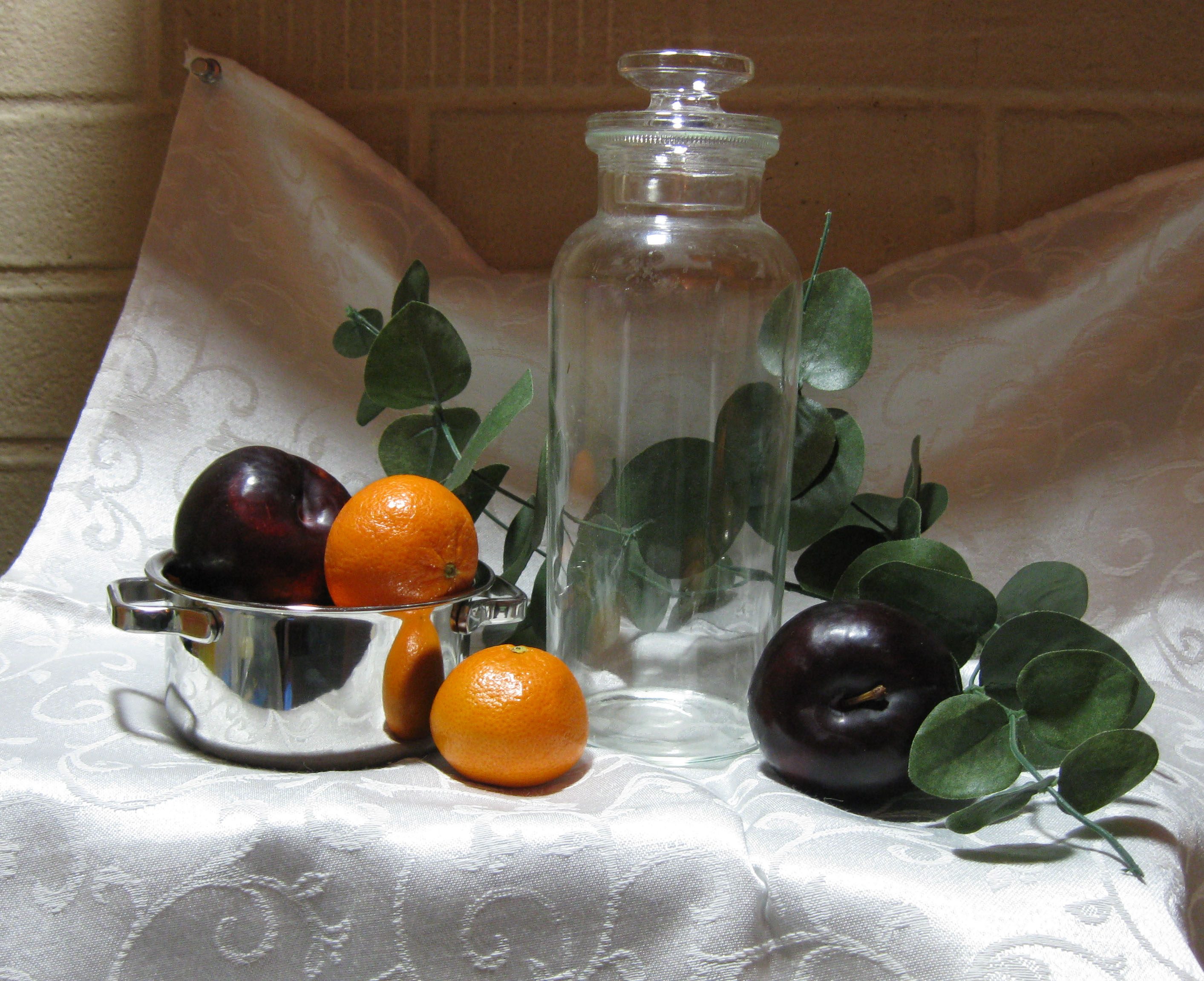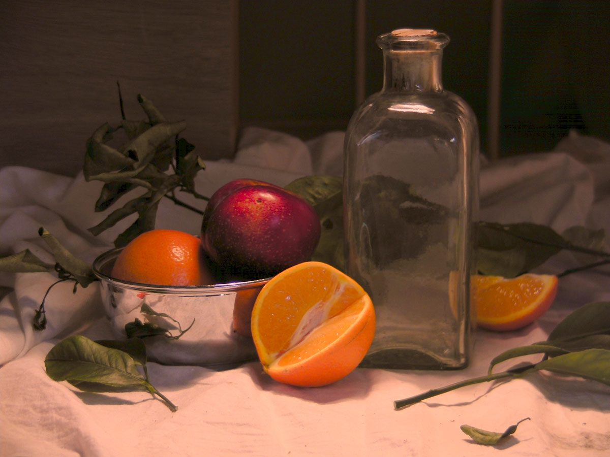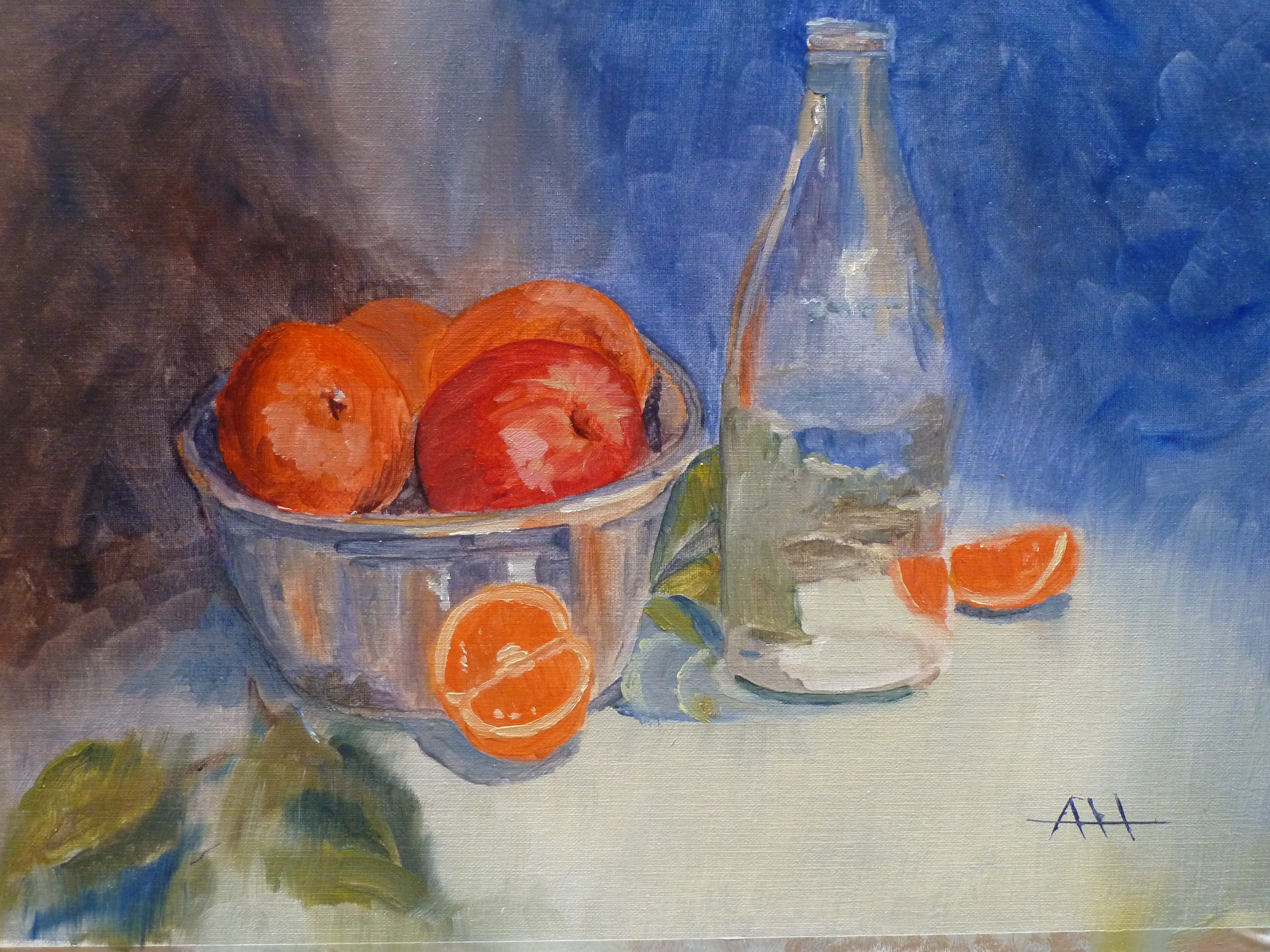 Design No, not the best design in the world, but not the worst either. :-) The more time you spend on setting up, the better it's going to get. The flat white base doesn't help - not much interest or character there. The lighting is the main problem though. You have two or more light sources which effectively removes shadows and detracts from the dark and light shapes of the objects, flattening them. Basically it removes variation, which is the prime key to interesting paintings. It also makes it more difficult to paint as there is less obvious dark/light information to work with. My advice is to knuckle down and sort this all out before you start painting because the most important thing about painting is that you are excited to be painting the subject. One dominant light source - start with that. Colour The blue/orange complementary design is one of my favorites. Do remember that when you're using a colour design like that, that both colours needn't be of equal vibrancy. You could gray that blue right down and it will still work well, and in fact that would make the fruit appear even more vibrant contrasted with a more subdued background. At the moment the vibrant blue draws a lot of attention, so what did you want to be the star player here - the fruit or the background? Okay, so you can subdue colours at your discretion to meet the aims of your painting. When you're trying to paint vibrant coloured fruit, laying on more and more strong colour will not help because you can only go as vibrant as what comes out of the tube, so the idea is to darken and dull the shadow sides in order to make the light sides look bright by comparison. Again, working with a single light source makes this easier. Brushwork Waterbased oils do seem to have a tendency to not cover the canvas as well as traditional oils, which means either laying down an acrylic coat of broad colour notes first or laying on lots of thick waterbased oil paint. That's my experience with them anyway. They also tend to muddy in mixture faster than normal oils, making it harder to keep vibrant colour. All that means is that you're battling with an inferior medium and that tends to destroy any fresh brushwork because you'll spend a lot of time just trying to cover the canvas properly. (I may get stoned by some die-hard waterbased oil painters out there for saying this, but it's just my experience after working with them for over a year about 10 years ago and then a few brief forays since then). Besides that, when you start thinking more in terms of light and shade families and start building objects systematically with value plains you will find that your brushwork will improve along with your understanding and confidence. All a matter of brush miles. Realism Well I've dragged you over the coals a bit here Annie, but hopefully some of it helps. Actually your milk bottle, which is arguably the trickiest part of this painting challenge is looking decidedly glassy and solid, so well done on that - especially the exaggerated refraction of the orange which shouts out "hey I'm all glassy over here!" What impressed me more than anything was that you did one painting in watercolour and also this one in oils, which reveals to me the curious spirit of and true artist, and that is beautiful beyond all measure. You go girl!