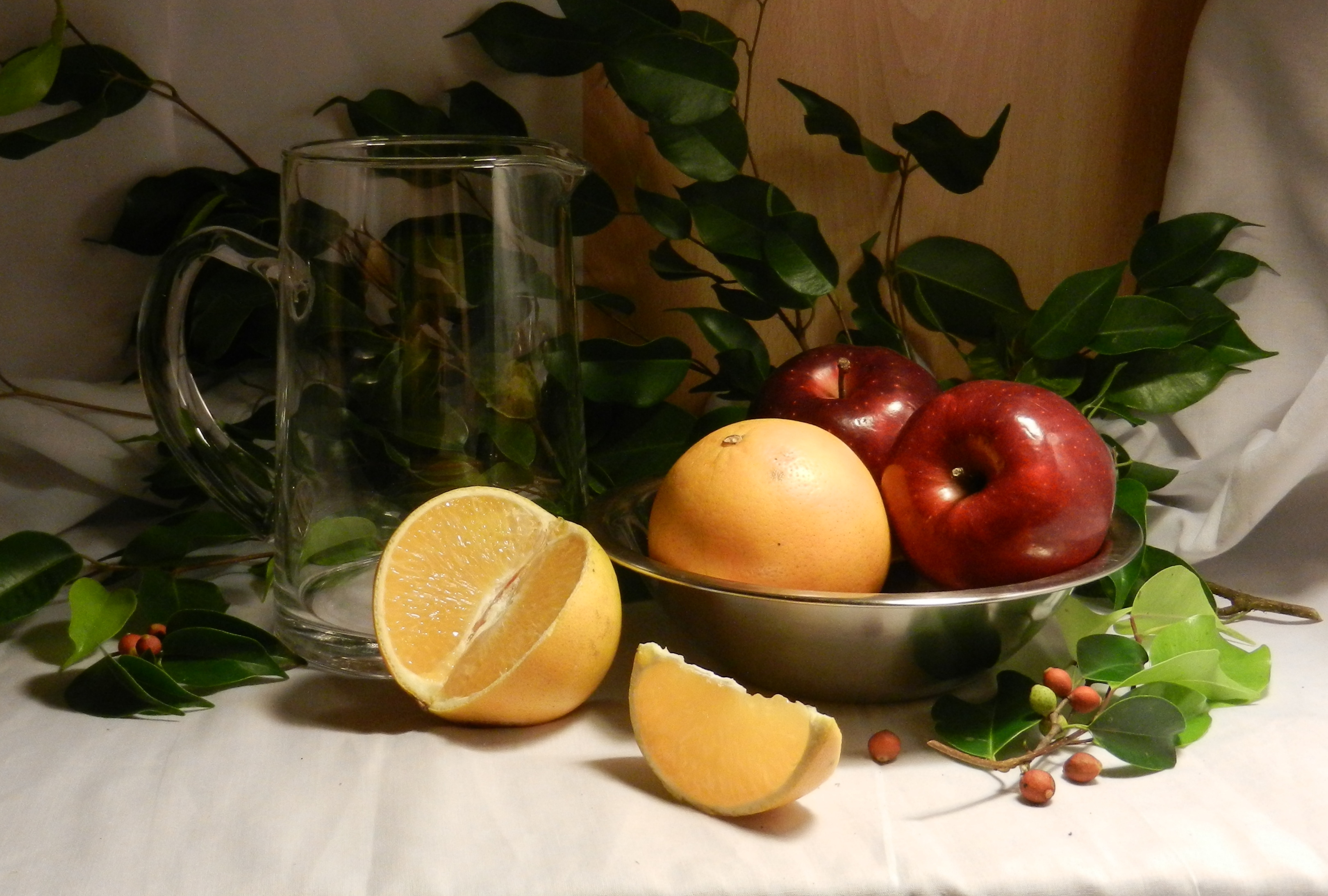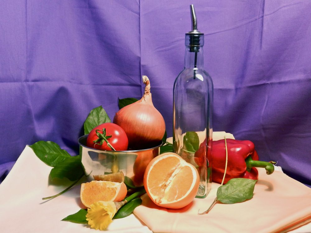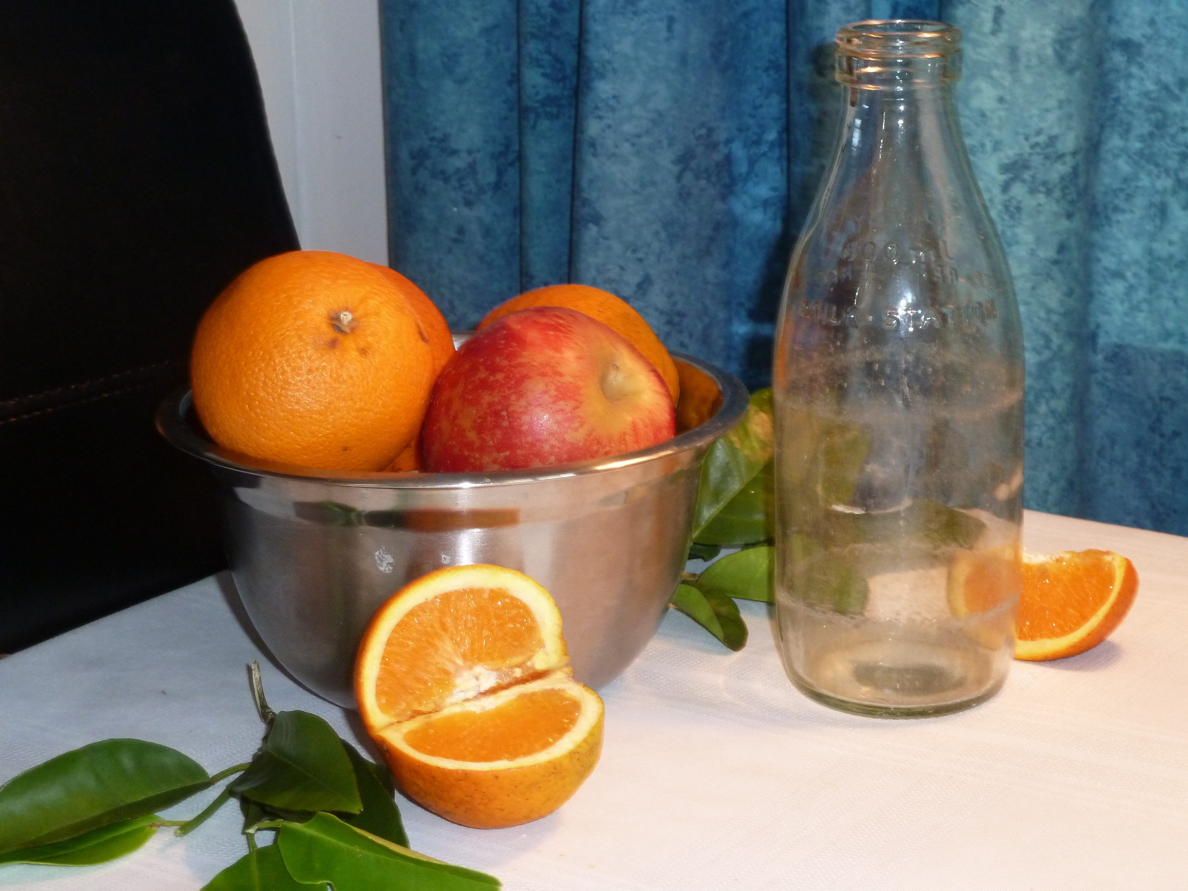 Design No, not the best design in the world, but not the worst either. :-) The more time you spend on setting up, the better it's going to get. The flat white base doesn't help - not much interest or character there. The lighting is the main problem though. You have two or more light sources which effectively removes shadows and detracts from the dark and light shapes of the objects, flattening them. Basically it removes variation, which is the prime key to interesting paintings. It also makes it more difficult to paint as there is less obvious dark/light information to work with. My advice is to knuckle down and sort this all out before you start painting because the most important thing about painting is that you are excited to be painting the subject. One dominant light source - start with that. Colour The blue/orange complementary design is one of my favorites. Do remember that when you're using a colour design like that, that both colours needn't be of equal vibrancy. You could gray that blue right down and it will still work well, and in fact that would make the fruit appear even more vibrant contrasted with a more subdued background. At the moment the vibrant blue draws a lot of attention, so what did you want to be the star player here - the fruit or the background? Okay, so you can subdue colours at your discretion to meet the aims of your painting. When you're trying to paint vibrant coloured fruit, laying on more and more strong colour will not help because you can only go as vibrant as what comes out of the tube, so the idea is to darken and dull the shadow sides in order to make the light sides look bright by comparison. Again, working with a single light source makes this easier. Brushwork Waterbased oils do seem to have a tendency to not cover the canvas as well as traditional oils, which means either laying down an acrylic coat of broad colour notes first or laying on lots of thick waterbased oil paint. That's my experience with them anyway. They also tend to muddy in mixture faster than normal oils, making it harder to keep vibrant colour. All that means is that you're battling with an inferior medium and that tends to destroy any fresh brushwork because you'll spend a lot of time just trying to cover the canvas properly. (I may get stoned by some die-hard waterbased oil painters out there for saying this, but it's just my experience after working with them for over a year about 10 years ago and then a few brief forays since then). Besides that, when you start thinking more in terms of light and shade families and start building objects systematically with value plains you will find that your brushwork will improve along with your understanding and confidence. All a matter of brush miles. Realism Well I've dragged you over the coals a bit here Annie, but hopefully some of it helps. Actually your milk bottle, which is arguably the trickiest part of this painting challenge is looking decidedly glassy and solid, so well done on that - especially the exaggerated refraction of the orange which shouts out "hey I'm all glassy over here!" What impressed me more than anything was that you did one painting in watercolour and also this one in oils, which reveals to me the curious spirit of and true artist, and that is beautiful beyond all measure. You go girl!