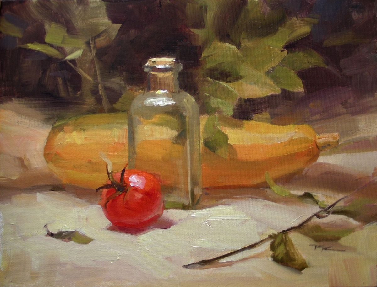 Design I love this design Dania - there is so much well orchestrated variety here it's a joy to take in. The purple background was a bold choice but you've quite wisely subdued that so it doesn't overpower the subject. Your objects are well placed with solid overlaps so none are 'kissing' edges and the colour placements keeps the eye moving around the painting from reds to reds, oranges to oranges, greens to greens. It's a rich concerto full of life and movement. Colour There's a subtle grey quality to your colour which makes me wonder if you are using black in your grays. To me it's neither good nor bad to use black in your grays - it's all a means to an end and if the final colours are good and harmonious then who is to question the means. I particularly like the colour you have in the capsicum and the metal bowl - both have been subtly seen. It's good to see you noting the subtler differences in the shadows of the tablecloth too which introduces the background colour into the foreground. Brushwork Your brushwork is one of the main elements that drew me to look at this painting. From a distance it looks quite carefree and lyrical but on closer inspection I can see that it is in fact quite tightly drawn and the brushwork is well considered. It seems, like me, that you are trying to loosen up your brush strokes and it is working well. If you want to go further the next step is to use bigger, juicy globs of paint, and don't mix the paint completely on the palette - allow some of that to happen on the canvas. Then of course there's always the palette knife. Depends where you want to go next of course. Where you are is great, but where to next? Some of your edges could do with softening off like the far left edge of the table cloth - it's sharp and high contrast - not a good combo for the edge of the canvas, but you have certainly done well elsewhere. It's up to the artist to decide what to accent and what to obscure. Yes this helps with giving depth to an object and a scene, but we might also consider 'what is this painting about?' Am I more interested in the jungle or the tiger? Realism Realism most often relies on drawing and value and on both scales you have done very well. Your drawing did lapse a little in the bottle and the bowl, although that's probably just more readily evident because these are precise man-made objects which we know to be more straight and regular than organic material. I find it a real battle to balance expressive brushwork with careful drawing, but hey if it wasn't a challenge who would do it right? Congratulations on a beautiful painting Dania.