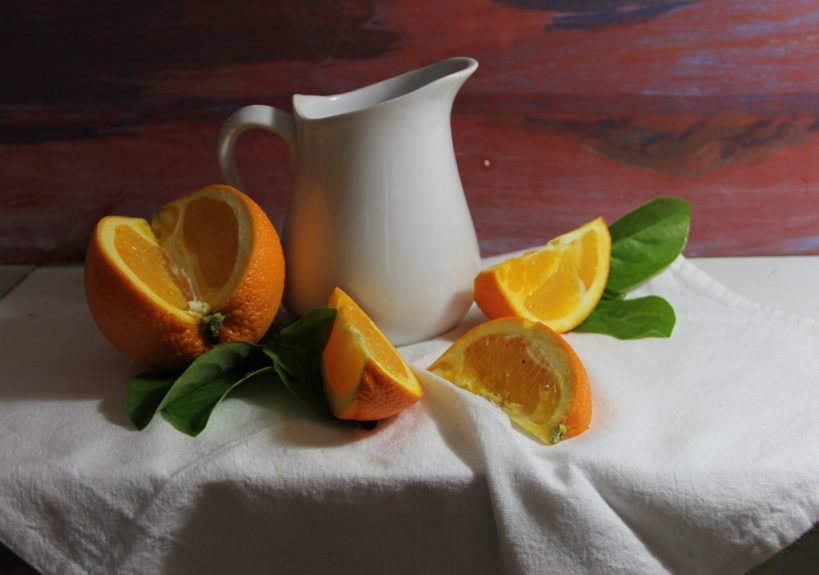Design Looks like a good strong design to me Annie - you've tied everything together in a circular fashion and the overall dark/light construction is very strong. I might have tried adding a leaf or two behind the jug on the right, but that's all. Colour Good bold colour nicely arranged. The strong red in the background might be stealing a little of the orange's thunder, but on the other hand it helps bring the greens to life. You have noted some subtle colour variations like the cloth getting cooler on the left (although it could have gone a bit darker too) but have missed a few key ones like the difference in value between the light and dark sides of the oranges. For instance look at the two on the right. It is not very obvious that the piece behind is in light and the other in shadow. The colours are too similar. Also, look at the rind in shadow in the full orange. Squint at it and it does not blend in with the other shadow colour there. It should. The value is too light. Also your reflection of that orange in the jug is mostly darker in value than the jug's shadow which it is actually supposed to be lightening, so the value of the orange there is too dark or the shadow is too light, or both. The gradation of colour across the jug could have been smoother to give the effect of glazed pottery, but that's more about brushwork. Hope that helps. The more you look the more you see. Brushwork Some of your brushwork is is fluid and bold and beautiful, while other parts are overworked - you know where, because you felt it when you did it. I see beautiful brushwork as an art in itself, but when you can describe something with a few luscious strokes it's a double-whammy - a perfect harmony of form and function. Something to aspire to. I'm always asking myself, 'how many brush strokes does this really need?' How can I use the brush in a clever way to paint a Haiku rather than an Encyclopaedia? But that's me. Depends on your goals. One note that might be useful to you is to be careful that your quest for exciting brushwork does not ruin your value structure. At the moment I'm seeing that happen in most of your surfaces, most noticeably in the jug where slight changes in value because of left over paint in the brush or moving from one area to another are causing streaks of different values and confusing the form. Realism There are the few things I've mentioned detracting from the realism, but also the drawing in some places which is very easy to see when you place the finished painting next to the photo. Just compare individual shapes and it's easy to spot small errors to watch out for next time. It's much harder to do while you're actually painting of course but hey it wouldn't be exciting if it wasn't challenging right!? Reading this again it seems I've really picked this painting to death but that's because I want to encourage you to do even better next time. Overall I think it's a very pleasing painting which leaves a lasting impression because for the most part it's been boldly and elegantly done. Good work!