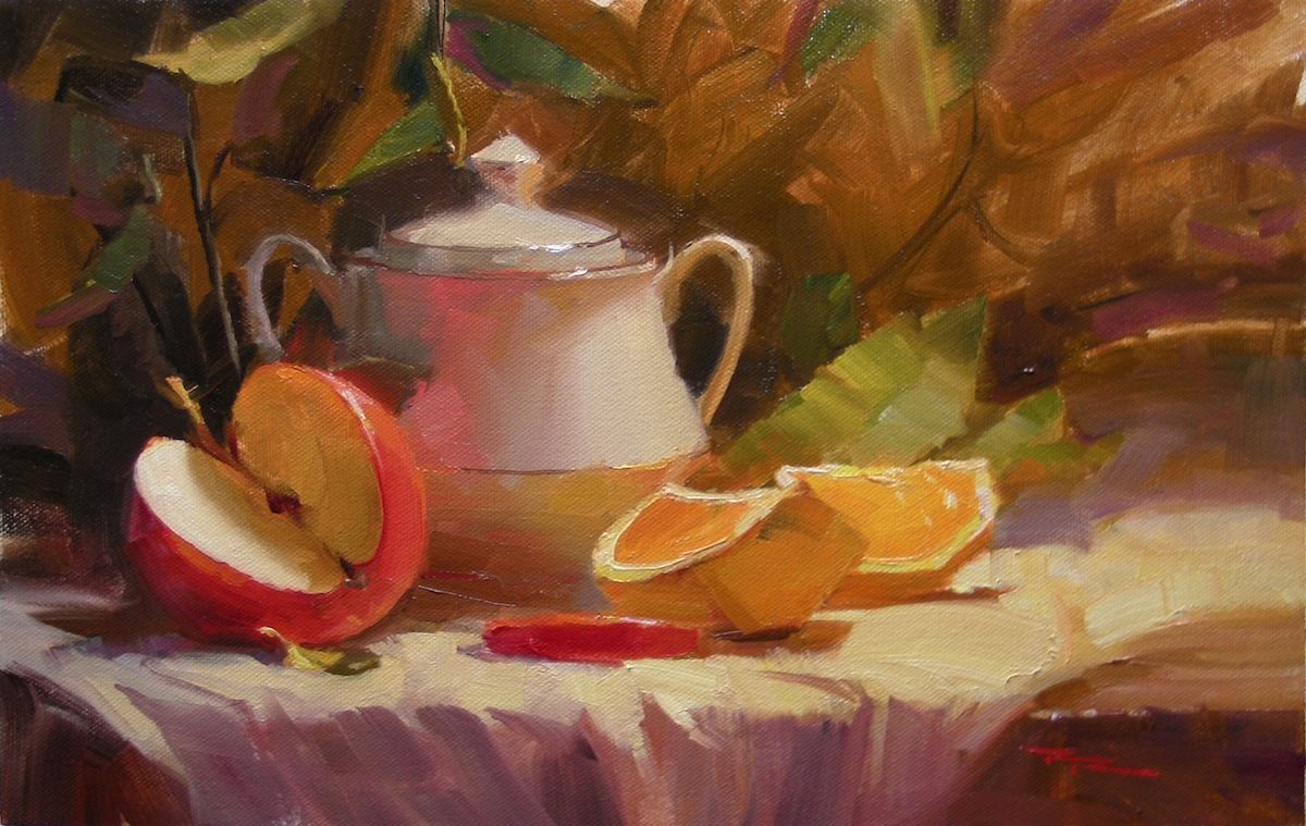 Design Justine I like your design and arrangement of colours - quite similar to my own setup so I guess I'm biased there. It's got plenty to interest the eye and keep it moving around the canvas. I would perhaps have given a tad more room on the left of the big orange and maybe a teaspoon in the cup leaning to the left would help with that empty area there. Colour Your colour is very rich and vibrant - a joy to look at, made more so by the contrast with the gray background. You have lightened the reflected light in many of the shadow areas more than what is natural which does add to the vibrant colour as a whole but tends to flatten the form as it confuses the distinction between shadow and light areas. If you want to avoid that just be sure to squint down on those shadows and compare the areas of strong reflected light with the surrounding shadow areas. Areas of reflected light still belong to the shadow family and should not be as light as the same object in the light. Nice to see the warm/cool variations in the cloth although there too the form is a little confused due to incorrect value relationships. The orange in the teacup is a little overstated and detracts from the form, as do the sharp edges within the face of the cup. You've really just got to look at the major colours and shapes that are happening, get those right and then add subtler variations. Brushwork A lot of your brushwork is bold and beautifully done - laid down once and left there. I can see you're battling like I am to paint the big shapes in a simple fashion but then add some fine detail to hold the whole painting together. I can only encourage you to keep going because you're well on your way there. The next thing to consider might be the possible relationship between thin washes and thick impasto brushwork. I think there's real beauty to be found there. You could also afford to loose some edges here and there in the shadows and glowing parts. Realism You're very close to some crisp realism here, especially in that orange on the left - beautiful! It's mainly just the incorrect values that are letting you down and the drawing could be a bit better too. Getting there, getting there! I haven't mentioned the light blue marks in the background as you said you have now painted over those, which is good. You've got a bit of glare happening on the left of this photo so just be aware of that when you're taking your next shot. Try to get a large dark background behind you (like an open garage). Great work Justine - keep it up!