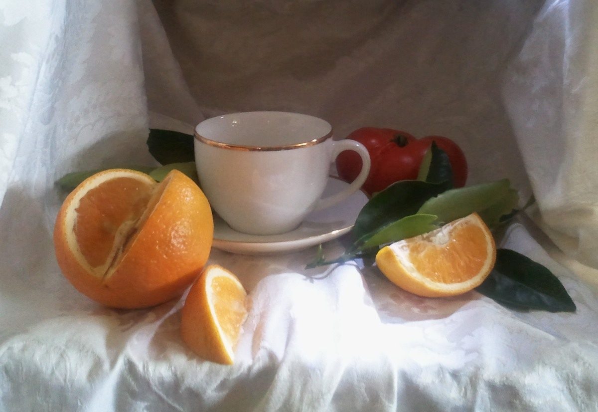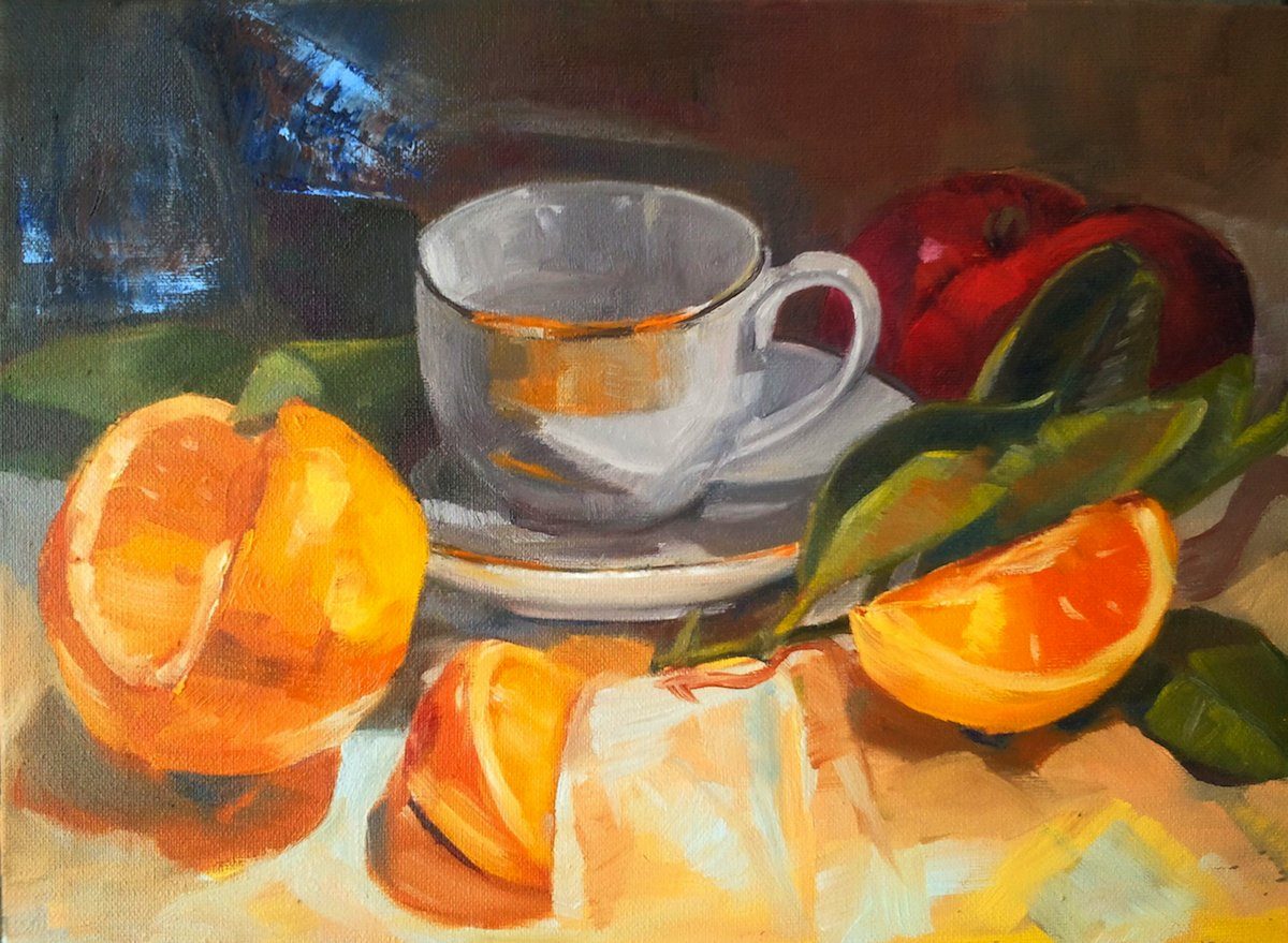 'Oranges & Tea Cup with Blue Leaves' Oil on Canvas, by Justine Wardle