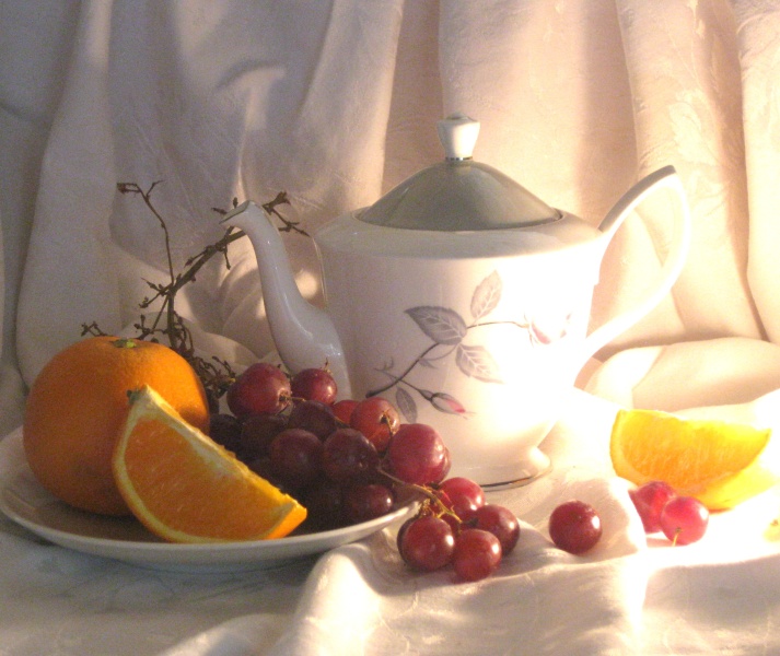 Design I love your design Karen, it's lovely to have the grapes flowing over the plate and leading the eye to the glowing orange segment. Good use of dramatic lighting - it's almost ethereal and perhaps you could have brought a little more light into the shadowed area on the left by rotating the orange segment there clockwise so that its right side was catching the light. As it is at the moment your two segments are very much the same shape where you had an opportunity to add a little more variety. That's being pretty picky but same shapes are something I try to avoid in my own arrangements. Colour You're getting somewhere now. Nice contrast between warm and cool overall, and you've noted some subtle difference within those too. A few things you could look at are the value of the pith in both the orange segments - it's too light which is destroying the illusion of shadow there. Squint squint! In the teapot you have a nice subtle cool to warm transition but perhaps the light is not quite light enough? It's great to see you casting reflected light from the orange segment on the right and that's something I encourage you to keep playing with. In the teapot you may have missed the opportunity to reflect the red grapes into the shadow side which would have made a nice counterpoint to the grey blue there. The orange light in the background fabric is striking from a distance but you've lost a little realism there by excluding some cooler grays in there, and the orange colour is so strong there it really takes the eye away from the subject of the painting. Similarly it looks to be a little too cool in the shadowed backdrop on the left and might have been more balanced including some slightly warmer notes in there. Brushwork Your brushwork has a nice feminine fluidity about it in some parts, however a lot of it is overworked - many brush strokes where one would suffice, flattening the paint and muddying the colour. That's only going to improve with brush miles and you're already doing so well so keep it up! Consider using a larger brush, more paint and be aware of painting value planes as described in the first still life workshop. Realism Well you can see yourself you're getting there. The grapes look pretty convincing as do several other portions of the painting, and your drawing is not too shabby. One thing you might try next time is losing some edges. For instance you could lose all that detail under the plate where it joins the table - just blur it together. Similarly in the photo the left side of the big orange is nearly the same value as the background so there's another opportunity to lose an edge. Same story in the big shadow area of the grapes - you've delineated every single grape which is not strictly necessary. Some things to think about. Hope that helps.