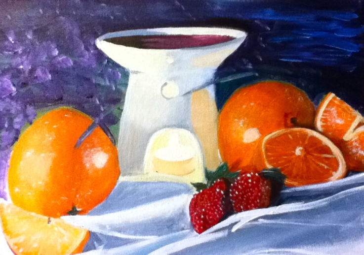 Design This is one of the most interesting designs we've had I believe, using the candle is a really nice idea. Makes me think of a little village. So yes you've got good elements in there but I do feel the design itself is not quite working. It's such a subjective thing though. If it was me I would have taken one of the big oranges out or have one behind the candle, or add another one. It's so hard to balance two of the same objects in a still life and you did try to hide one a bit but they're both similarly placed on each side of the canvas so it creates a division. Colour Good strong colour throughout and with a few subtle variations noted here and there. You handled the glowing candle light particularly well. Here are a few things you could look at: you might have grayed the purple in the background to avoid it jumping forward, the cloth appears to be too light, as does the ceramic holder which lessens the effect of the candle light. The fold in shadow on the right of the big orange on the left is much too cool as it should be picking up that reflected orange light and getting darker closer to the orange. Brushwork Looks like you have a tendency to try and smooth everything out which is easily overcome by cutting one finger off every time you do this. Jokes! No, it's hard to stop yourself doing this. One good exercise is to do a small simple painting of a pear for instance and limit your painting to say, 30 brush strokes. That's 30 times the brush can touch the canvas. You'd be surprised what a bold dynamic pear you can paint with 30 brush strokes. You've tentatively started softening some edges there and I encourage you to continue pushing forward with that. Realism Some of this rates very high for realism, which is really just a measure if how well you have seen your subject, so it encompasses everything. I love the way you have handled the candle and think that's the crowning achievement of this painting because it's a very tricky thing to do well. Your oranges are beautifully round and edible (and I don't say that to everyone I meet) but your drawing is a bit wonky in places like the tilted ellipse of the half orange and the symmetry of the candle holder. Some good work here though. Keep it up!