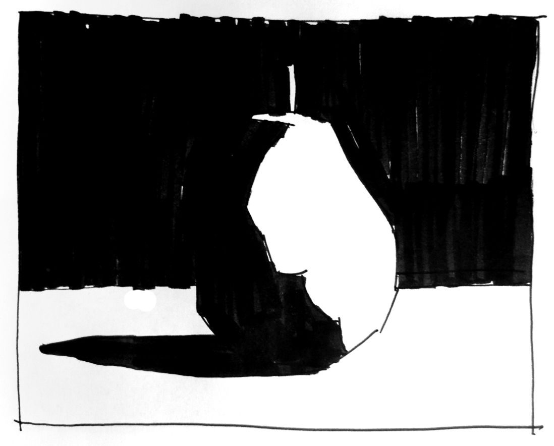 Replace the pear in your still life with this planed pear. Using a black marker pen draw the pear on paper in just black and white areas, separating the light from the dark. Remember the half tone (the area between light and shadow) belongs to the light. Include the cast shadow in your drawing. Squint at your pear to help you see the large masses. When we are painting later on we will be looking first for the light and shade areas in this way. You will notice that the black base is part of the light family except where a shadow is cast upon it. The brown background is in shadow so it too becomes part of the shadow family. Now you should have something that looks like this..