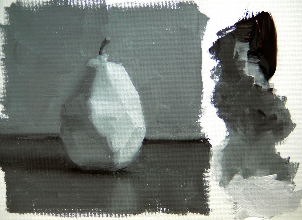 Using the planed pear, paint a value study using only black and white paint on a 6x6" canvas. Feel free to mix your own black with Ultramarine Blue + Burnt Sienna, or Pthalo Green + Cadmium Red or something similar. Use a fairly large brush so you don't get carried away with detail. You should just be trying to capture the individual value of each plane in correct relationship with the planes next to it. Keep squinting! Use a colour isolator if you wish to help judge relative values. Now you should have something like this...