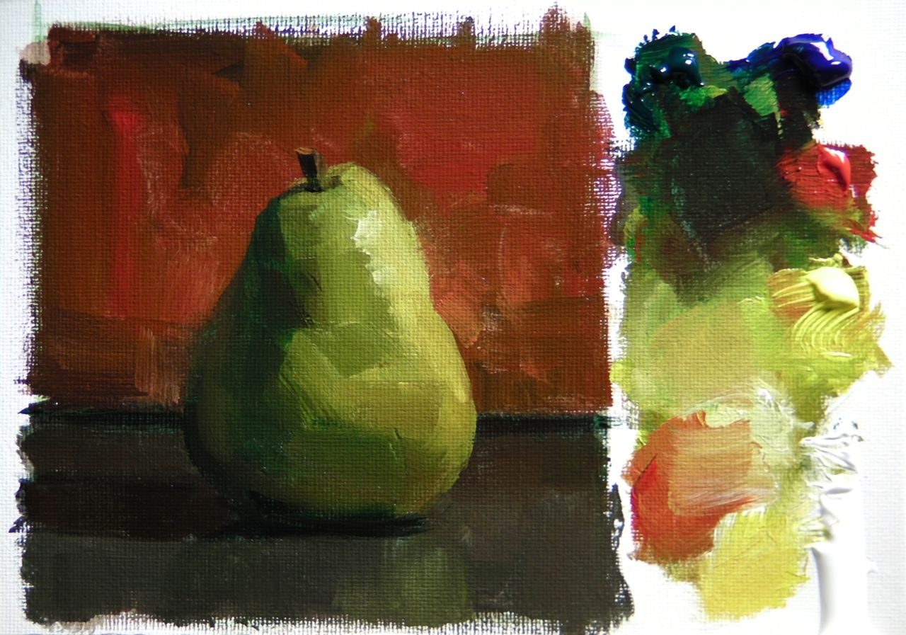 This exercise helps you to learn to see and paint the large colour masses and to simplify your brushwork. (It can also cause fits of despair and hopelessness and short but sweet moments of absolute clarity). Using the same setup and colours divide a 10x10" canvas (or similar) into 4 quarters and give yourself just 10 minutes to paint the pear in the top left quarter. Use a timer. Stop as soon as 10 minutes is up. (No cheating!) Next, change something about the colour arrangement in your scene and give yourself another 10 minutes to paint it again in the top right quarter. Repeat in the bottom left and bottom right.