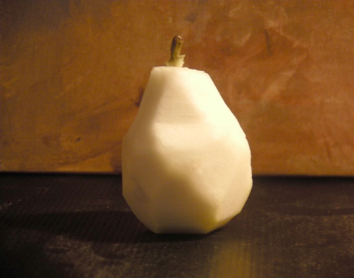 Replace the planed pear with the normal pear and paint a 6x6" colour study using an extended primary palette of Pthalo Green, Pthalo Blue, Cadmium Red Light, Cadmium Yellow Light and Titanium White. Again use a fairly large brush and try to segment the pear in your painting into large planes of separate colour as in the previous challenge. Make sure every plane is a different colour. You may soften edges between planes but do NOT paint large blends. Start with your darkest dark and lightest light. When you're trying to see colour differences between planes it's better to defocus your eyes rather than squinting because squinting darkens all the colours. Closing one eye helps too.