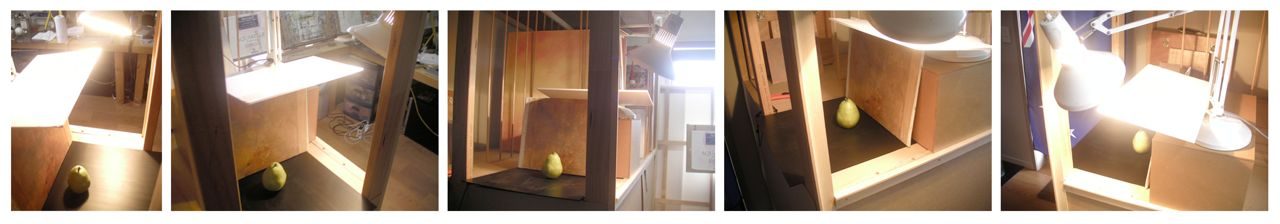 Here's how I set mine up - pretty simple. Note the card over the top which is casting a shadow onto the background. The pear is placed just forward of this cast shadow so that it is in full light contrasted against the darker background.