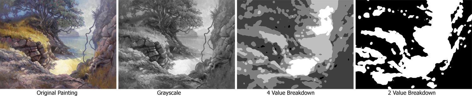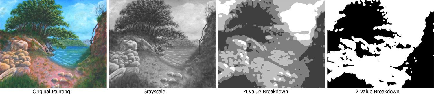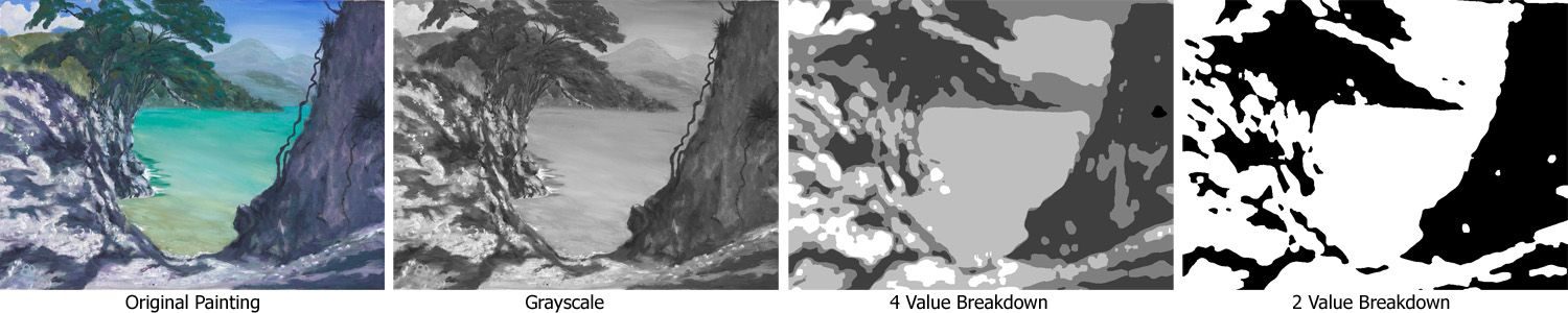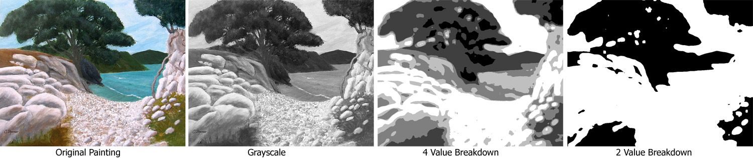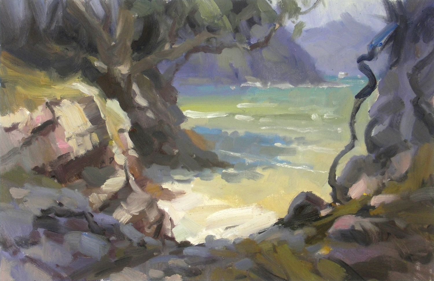 Design I like the design which is quite close to my own studio painting design except that with mine I was careful to add colour interest into all that gray foreground - something that you haven't managed to do which makes the whole foreground look a bit like a desolate moonscape. So the grayscale design itself is good and strong but it would work better with more colour interest in the foreground. Colour That foreground gray would look better with more variation thrown in - like a good salad, lots of colour is yummy. You've tentatively added some warms in there but before you go adding colour in there willy nilly you need to understand where and why the colour variations occur. In my own painting I was concentrating on warm planes and cool planes. Warm planes occur where the warm sunlight hits them directly. Darker warm planes occur where they are tilted towards sunlit areas of rock or sand which are a reflecting their own warm colours into the shadows. Cool dark planes occur where they are turned to the sky or away from the sun, reflecting the blue of the sky. The tree could do with some light thrown on it and the hill behind could have been pushed further back in space by lightening and adding gray/blue to help separate the tree from the background. Brushwork You've used a variety of large and small brushes which is good to see and you've created some interesting texture in the rocks. The water seems to be a little overworked as does the sky and furthest hill, removing most evidence of brushstrokes which takes a bit of the interest out of it. Some waves or wind lines in the water would have helped to add interest there and softening the edges of your distant hill and clouds would have helped push them even further back into space. Realism Except for the few things I've mentioned the realism is pretty good in this piece. The dappled light over the rocks is such a complex subject you've done well to try to paint that at all whereas some people avoided it altogether. You haven't quite managed to convey the effect of a tree casting a shadow - the shadows need to be linked together the same way a tree is linked together. Good try though, and hey, I didn't manage it even in my studio painting either which I spent a week on. The cast shadow on the water is a bit conspicuous too - it should be bluer and the shape larger, because it looks like it's not quite sure if it should be there, and the white foam isn't helping either because it should be a blue grey in the shadow there. Those are pretty minor things though. Good work.