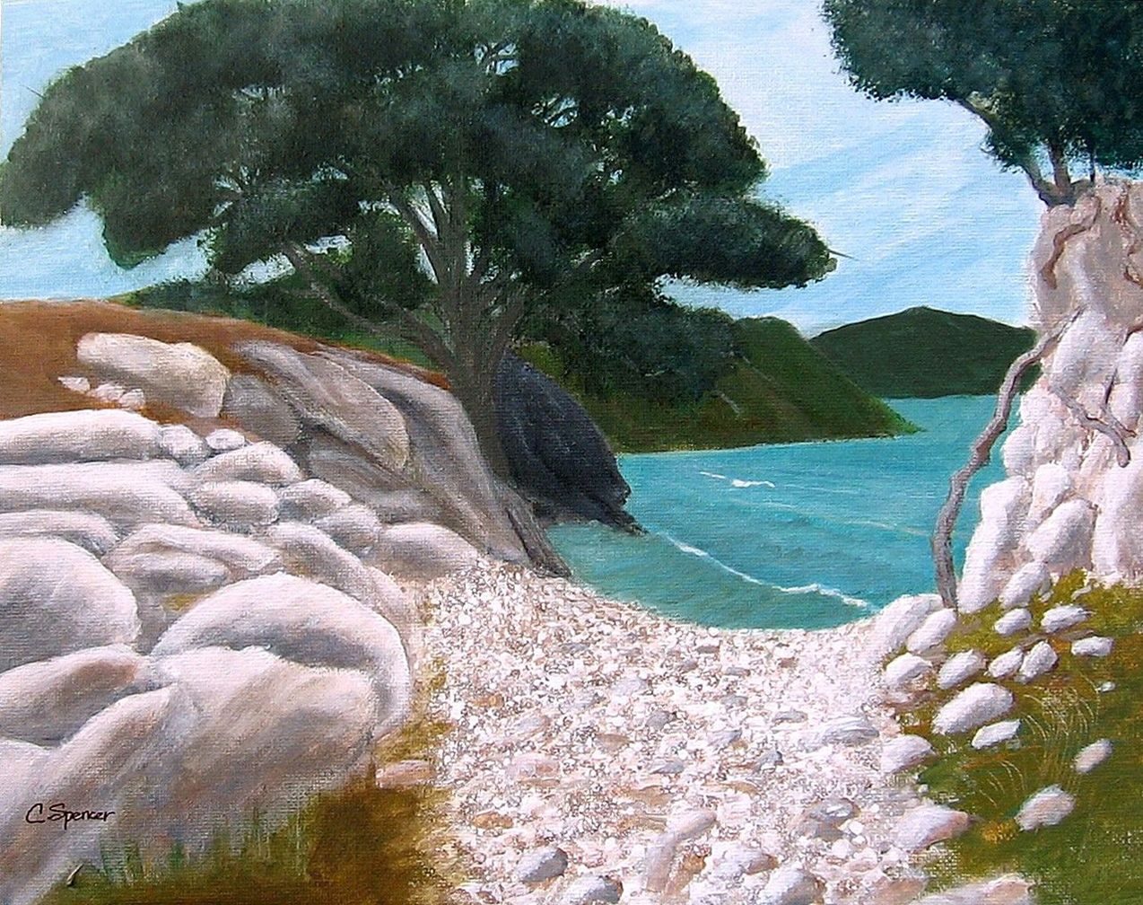 Design I like how you have simplified this scene Catherine and made a somewhat symbolic or iconic artwork. The path to the beach is a bold addition which gives the painting some narrative. The top of the cliff on the right was somewhat problematic in the photo but you have solved that nicely with a tree which also helps to balance the main tree. I think that a shadow across the foreground would have helped to unite the two patches of foreground grass and also would have helped to shape and lend perspective to the somewhat flat path. Colour As with the drawing, you have simplified the colour which gives it a sort of naive charm but also reduces the amount of time it might hold a viewer's interest. If you do wish to begin adding more colour into your work you'll need to spend more time analysing the subtle colour differences found in every object and the way light is reflected from one object to another. There is not one speck of the universe which displays flat colour so let that be your guide. Brushwork Part of your trend to simplify has been to remove evidence of brushstrokes which again removes interest from an artwork unless other factors like detail or colour step in to take its place. What does hold my interest is the detail you've put into the tiny rocks and pebbles in the pathway which is really a delight for the eye. Realism There is no strong sense of light direction here - something that can be remedied with cast shadows, and again the simplified forms lead this piece away from realism, but perhaps that's not your goal. It really reminds me of Giotto's fresco work if you care to google his name. Sometimes by simplifying objects we make them grander - they become symbols of themselves.