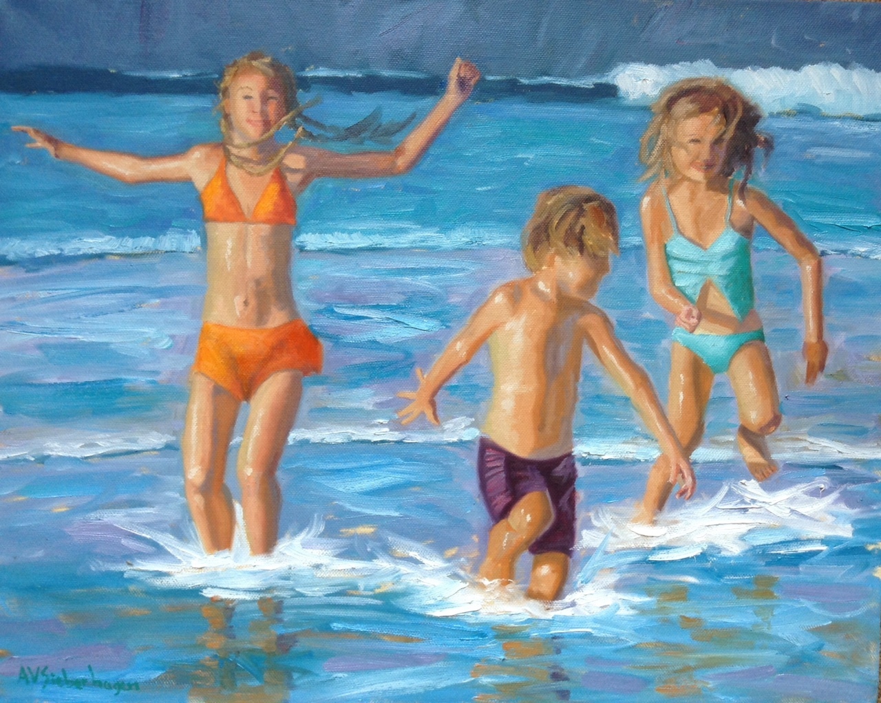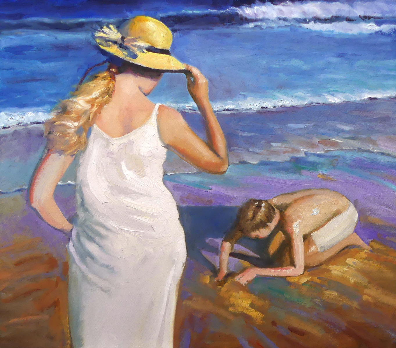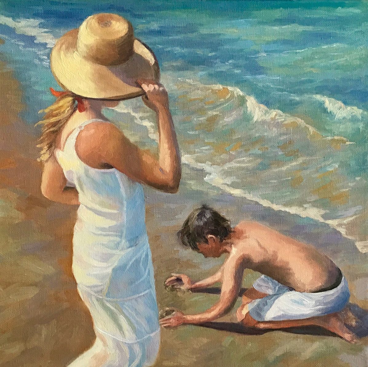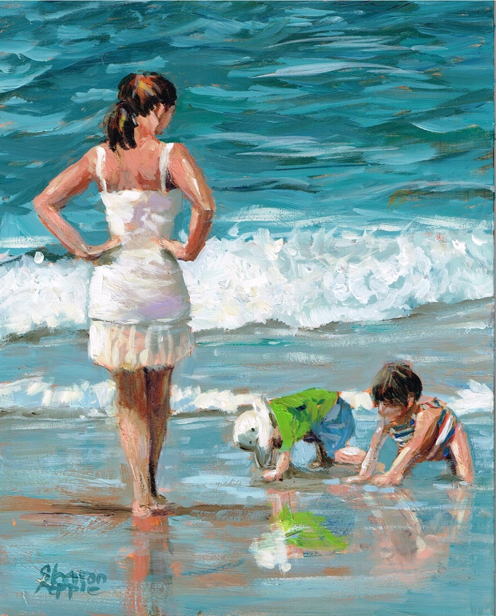 "This is a painting of my step-daughter and my grandkids. She had on a navy bathing suit but I changed it to white so that I could try all of the wonderful techniques Richard taught. Love this video, learned a lot and really need to learn more about mixing skin tones. Thanks so much Richard" - Sharon Repple Thanks Sharon, you're welcome! What a great painting you've managed in a 10x8"! Lovely design, colour, brushwork and figure drawing. My one and only reservation is the placement of the horizon above the top of the picture, which is giving the appearance of an imminent tsunami. I've done this too in the past and regretted it. Much better to obscure the horizon with weather or a bluish distant hillside. The horizon here would be close to her shoulder, judging by the positions of their feet. Other than the tsunami, great work!