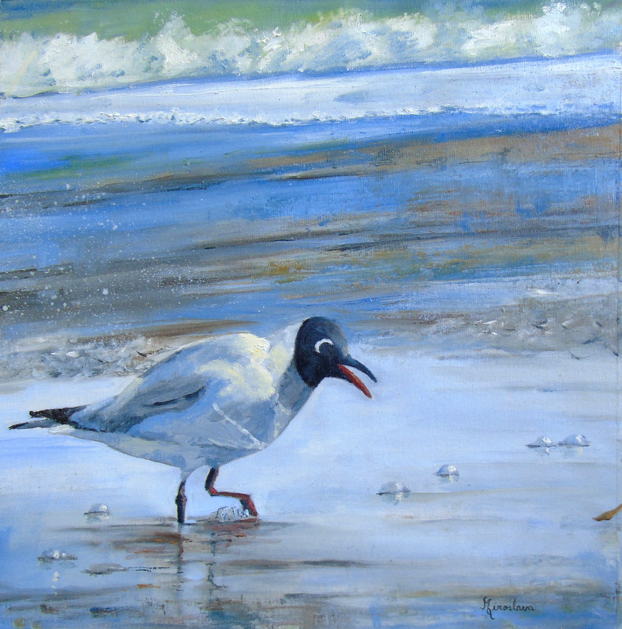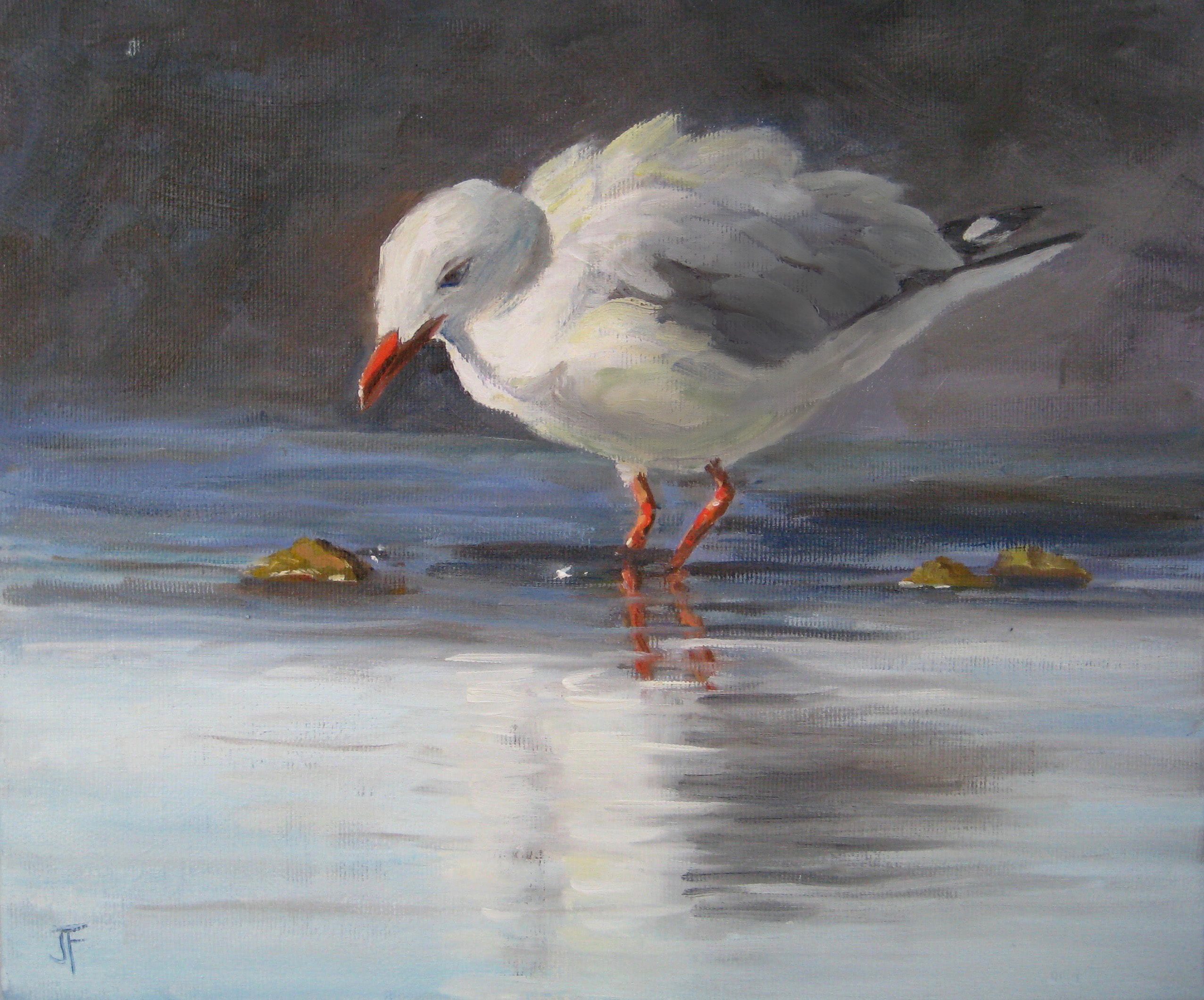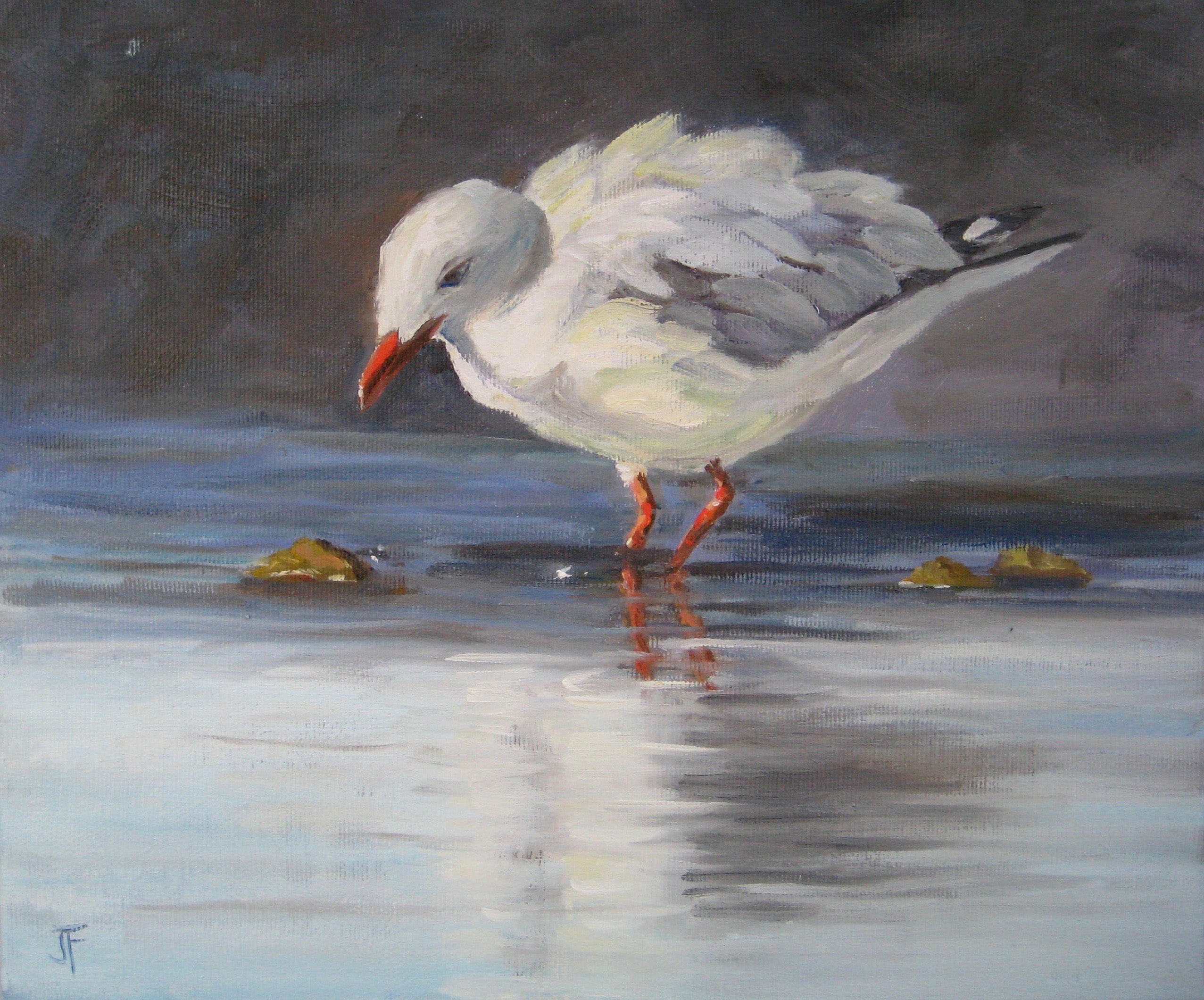"Local gull found in the Atlantic Ocean. 'Brown Hooded Gull'. It's a really funny looking gull with a great expression!! It seems to be a cartoon.... but it isn't!!" Looks like you had lots of fun with this one Silvana! Nice off balance design implying movement and action. Good modelling of the bird from light to dark, although you could possibly have made him even rounder by darkening the shadows a little. That's a minor thing. I love how you've made this painting part realism part abstract by exploring all the textural possibilities in the wet sand. Great work!