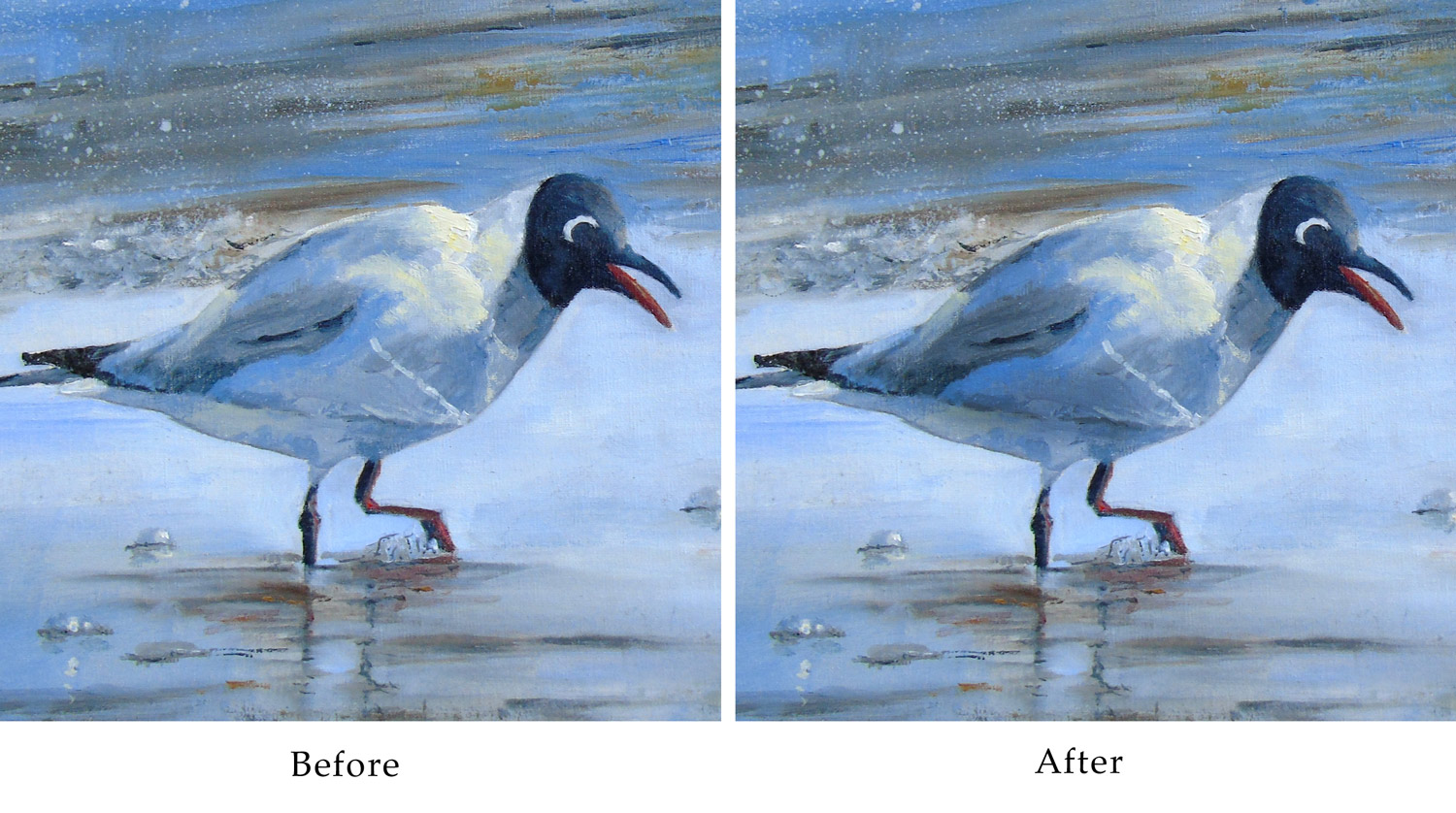 Good work Gail. A polar opposite to Tone Larsen's painting, above where you've carefully delineated each segment. Great job capturing the form of the birds including beautiful warm halftones. Same goes for the translucent and reflective water. Not easy but you did it well. If it were my painting the only thing I made change would be to add more glowing light bouncing of the brightly lit chests as I demonstrated in the video. It's just one of those little touches we painters can add to out-do the photograph.