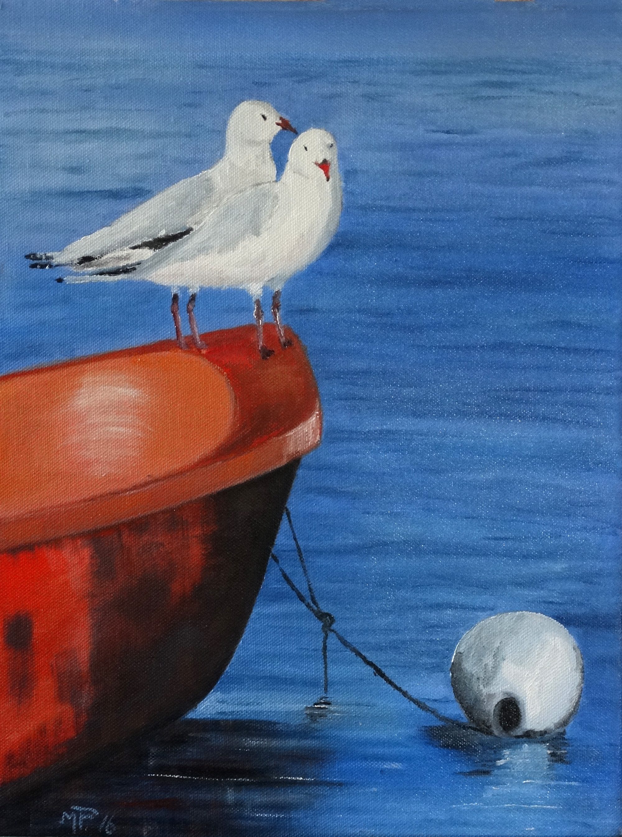 Nice composition Mark and strong colour use. Would like to see a little more colour variation in the water (some green shifts?) and particularly an overall slight colour change from top to bottom, which would give it more depth. Good seagulls but it shows you the importance of getting a photo without frontal light because it gives them no interesting shadows to work with and flattens the form. I would be looking for a way to separate the birds, like with shadow on the bird behind or colour change on the back of the front bird. Their feet need looking at too - they're too small at the moment. A few tweaks and you're there.