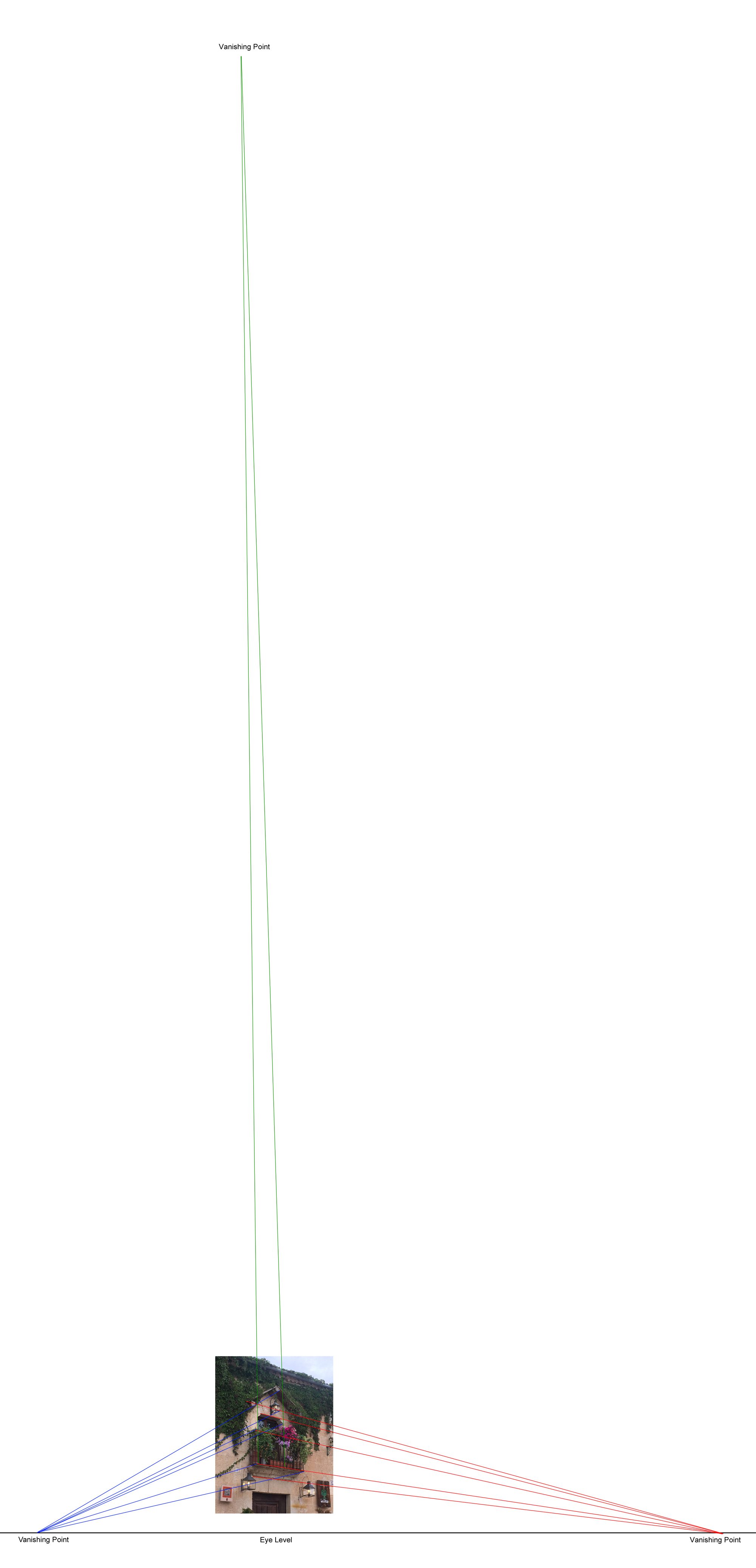 The lines we would expect to be horizontal actually converge to points on the horizon, which is always our eye level. (Click image to enlarge).