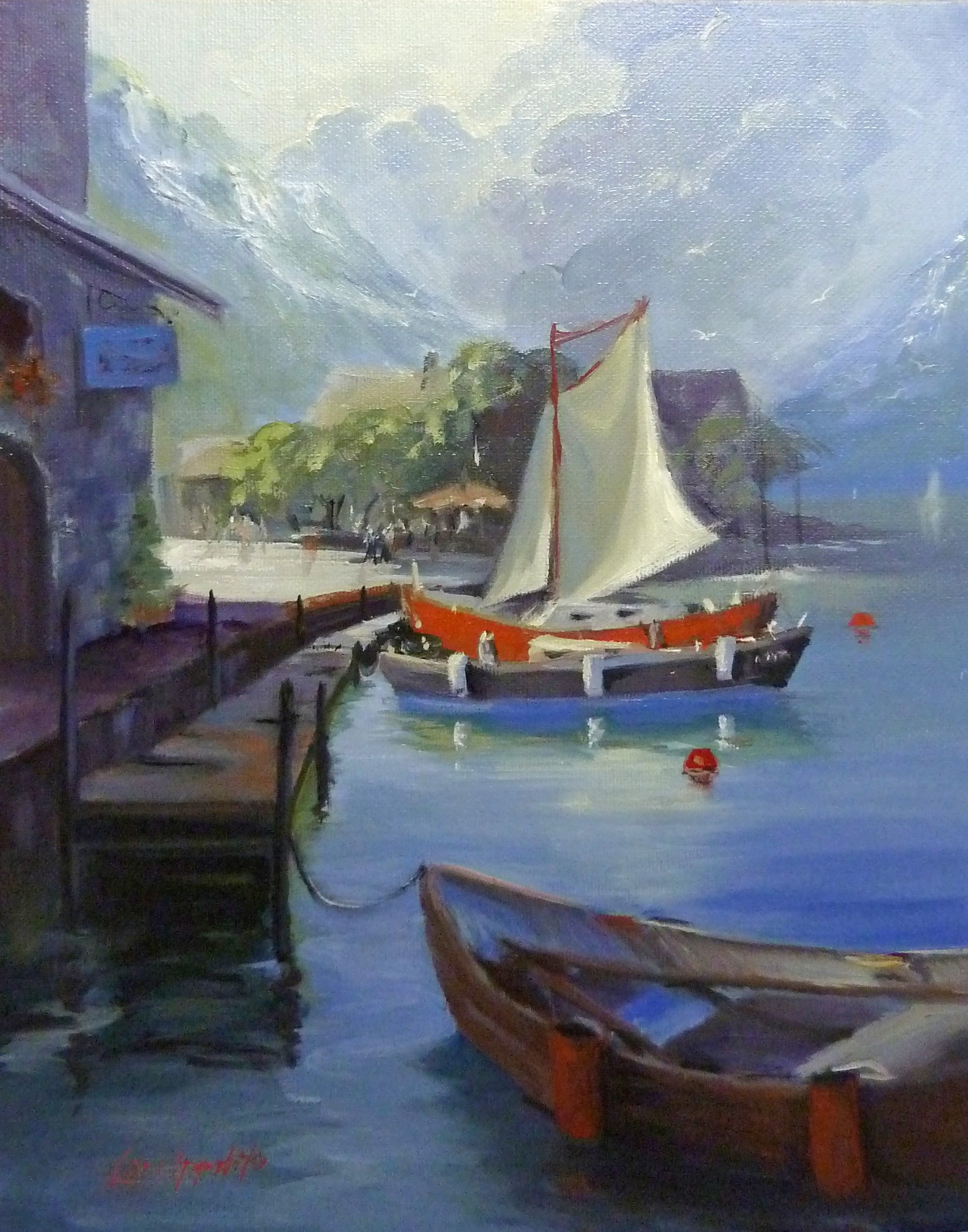Great work Lori! I like the dramatic swoosh of the background echoing the smooth curves of the sail. Great atmospheric perspective there! The colours seem to be working very well together with a few blue exceptions in the reflection of the central boat and the midground water on the right becoming a bit too punchy. The drawing of the dock and buildings are very good but the boats could do with a little straightening, most notably the waterline of the black yacht needs to be flat and horizontal on the water. Nice to see you varying the colours in the shadows which many people have made too dark and colourless in this project.