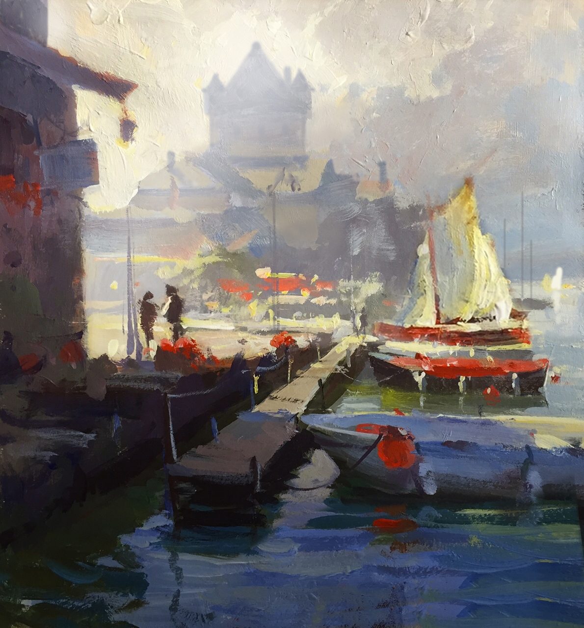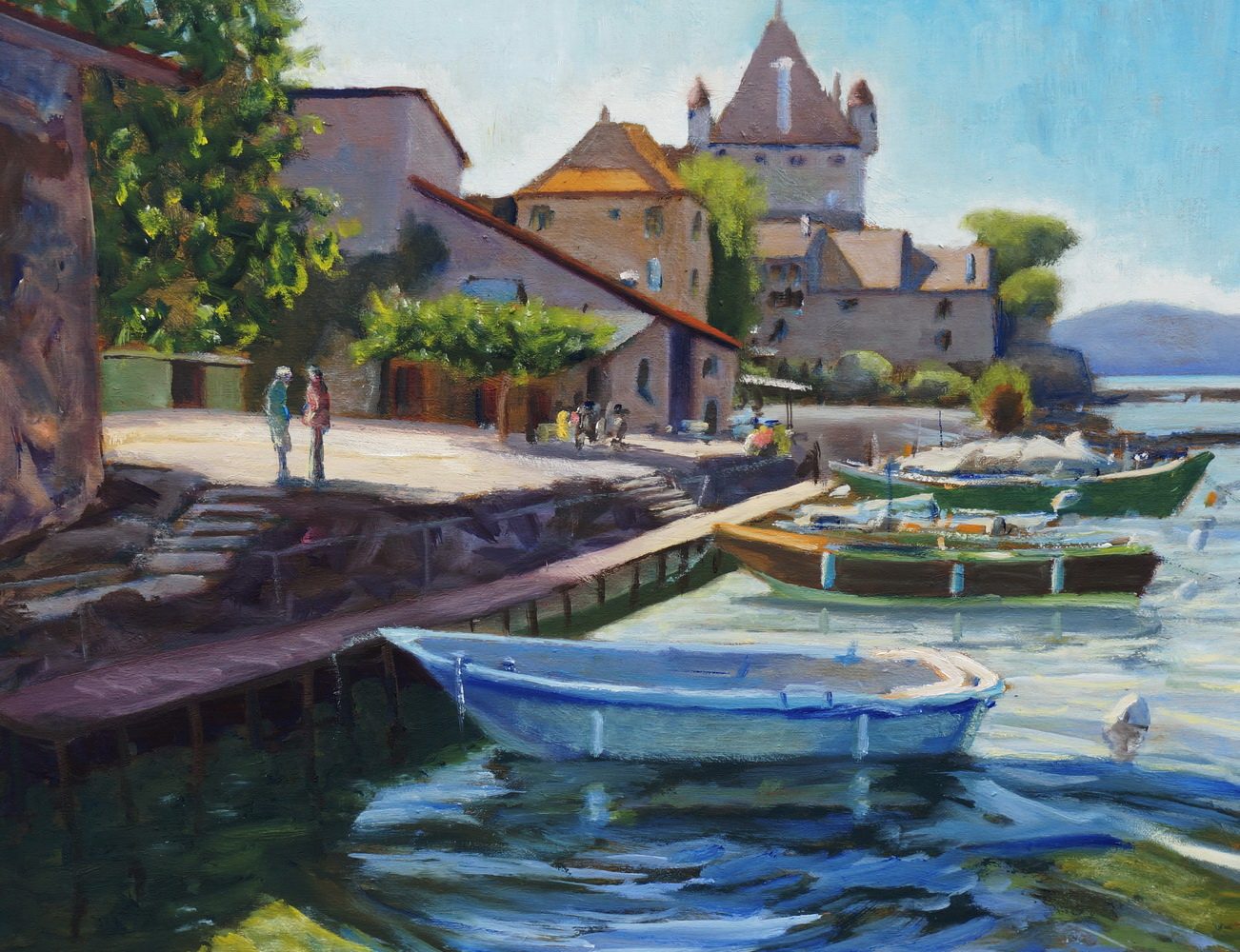 "Hot Summer's Day (Yvoire - vue du port avec le château)" 50x65cm Oil on Canvas by Jon Main