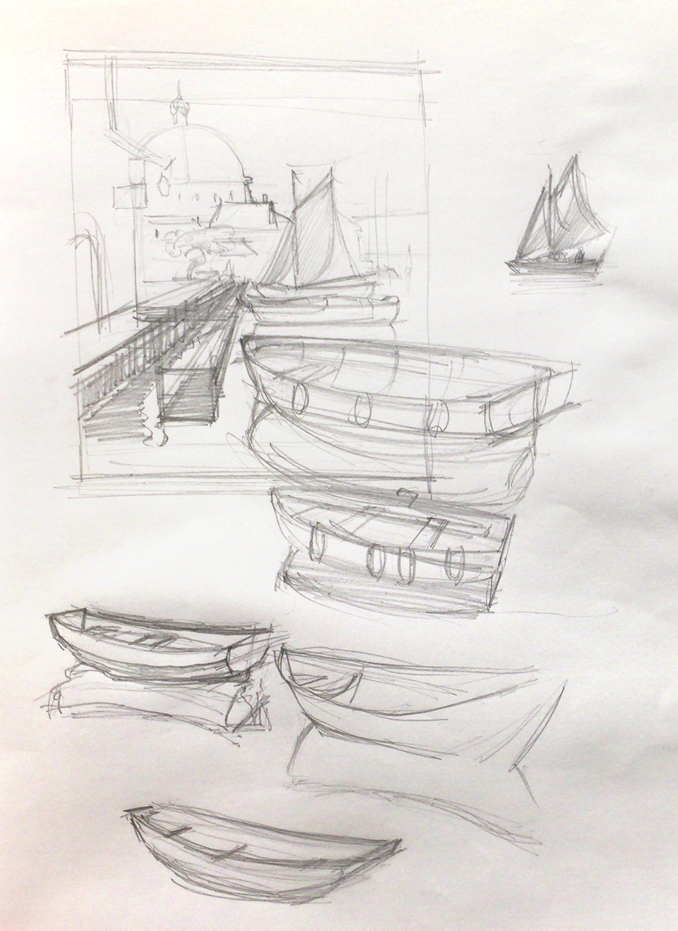 The dome was a nice idea but now the boats struck me as being too tidy - lined up like a car park, so I thought to angle the foreground dinghy and explored some different types that might make an interesting shape there.