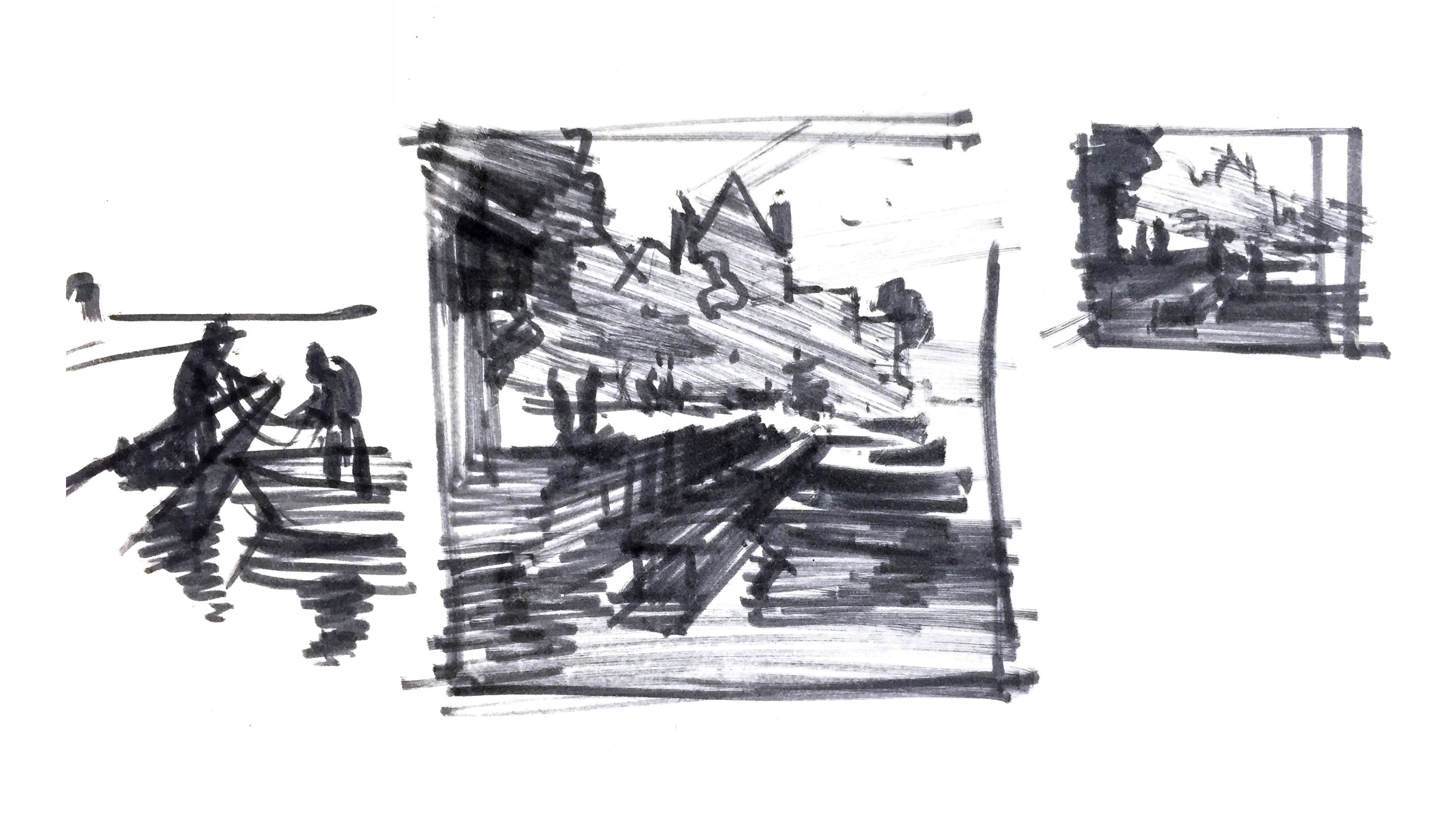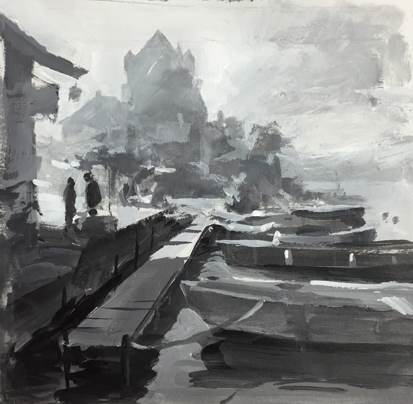 Keeping these sketches very small saves you from wasting time getting carried away with detail. This sketch in the middle measures about 2.5x2.5". Any bigger than that and you're wasting time not focusing on the big shapes. I was thinking of adding a couple of fishermen into the foreground handling a net but that would require models, and eventually I went with the idea of adding a sailboat as the center of interest.