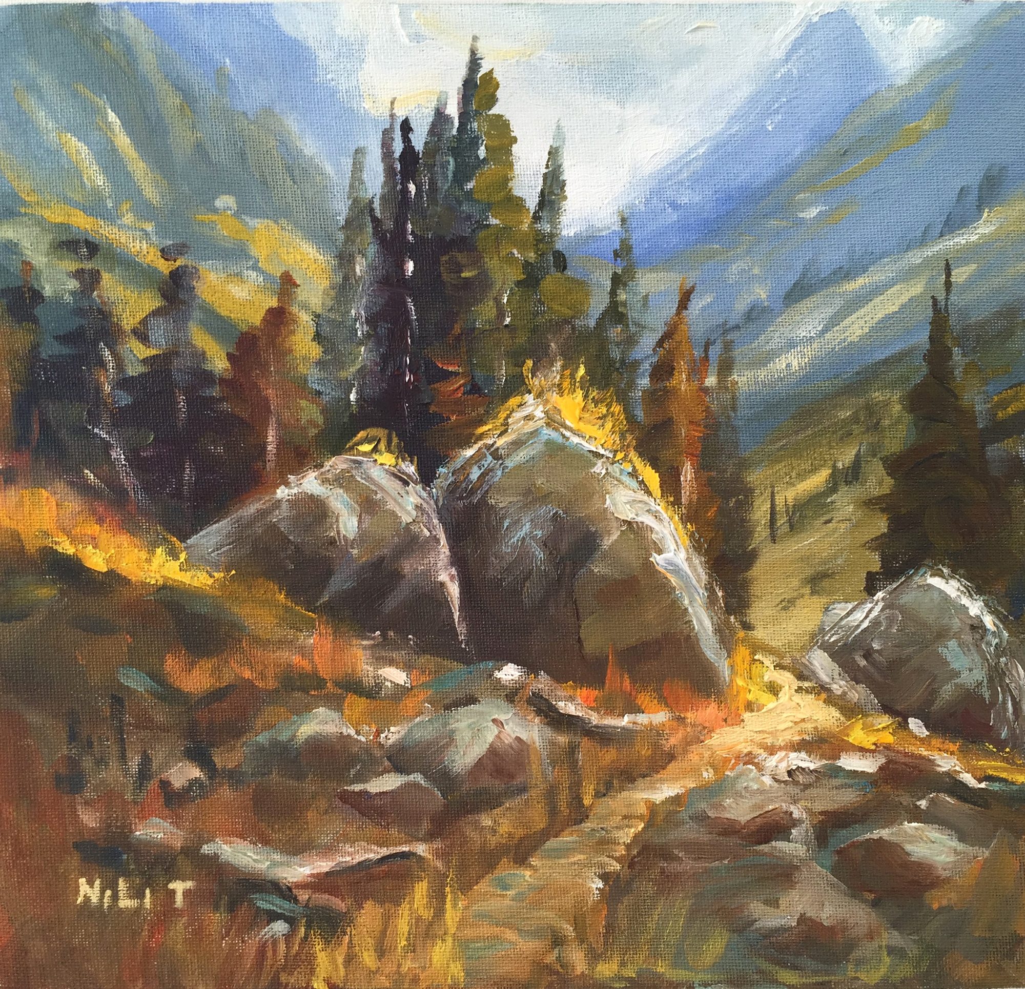 Your painting has good colour and tones Susan - good lights and darks that give a nice sense of sunlight. I like the blues that you have used to get a sense of distance into the mountains but you need to be careful when you apply the highlights to those distant peaks - they are too green for that distance. I like the colours used in your trees too but you may notice that the tops of the trees are In a straight line sloping down steeply to the left, as do the hills that we are standing on so that the painting has developed a strong feeling of sliding towards the bottom left corner. When I look at your rocks, I get the feeling that you are painting what you know, not what you see. The shapes of your rocks and their whole character suggest that you are making them up. Probably the easiest way to solve that problem is to go outside, find some really nice boulders, and sketch and paint them. If you can get the choice of coastal and inland boulders, all the better!