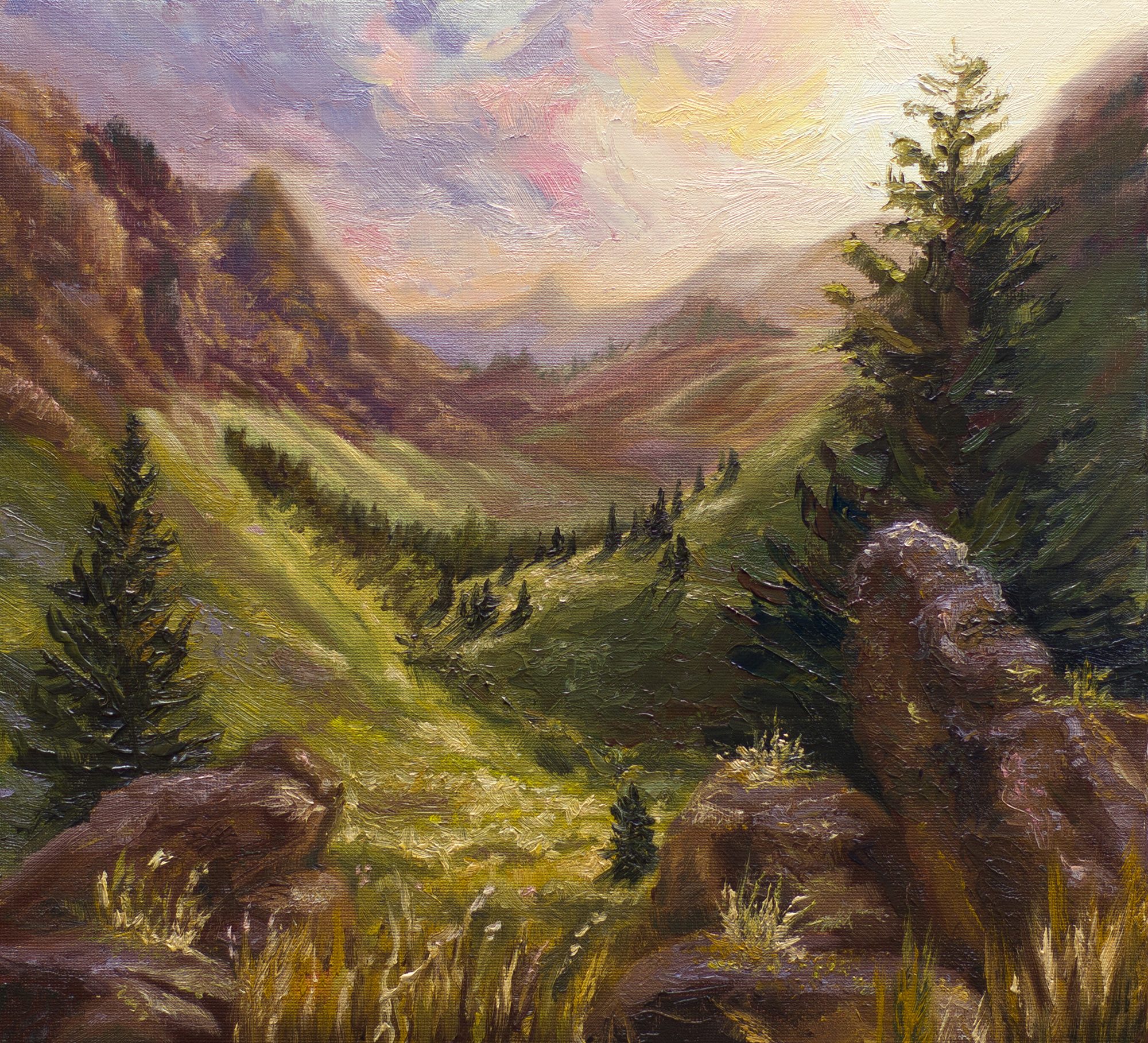 Painting a diffuse light effect, vast atmospheric depth, dynamic brushwork and inventing convincing rocks are all demonstrated in the video. Enjoy!