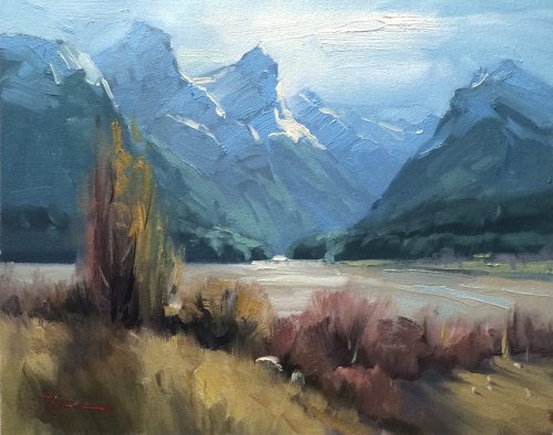 Another painting with heaps of colour - very bold! Nice free brushwork and well set out although the boulders could have been be moved off - centre a little. However, (and this is possibly a personal thing), there is a point where a painting can become too 'chromatic,' too much of the complementaries - where the colours are all yelling for attention at once! At that point, the painting will have lost it's theme - the overall colour feeling that 'glues' it together. More neutral colour with small areas of brilliance in the right places is often a better way. Even brilliant flowers look better with neutrals around them. Don't go overboard and make your work look depressed though! - Many thanks to John Crump for his thoughtful critiques. You can see John's own paintings and teaching dvds at www.johncrump.co.nz