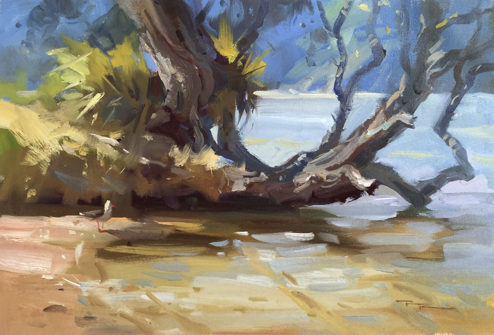 Pataua is an amazing place. On a summer camping trip we stopped and spent the day in this quiet corner flapping around in the water with the kids and picnicking on the beach. Walking out on the trunk over the sparkling water the beauty of the place took my breath away and I just remember thinking, 'Wow - this is New Zealand right here!' Meaning that if one shimmering jewel of a scene were to sum up New Zealand's beauty, this would be it. Of course we have countless scenes which the same could be said for, but when this one caught my eye I HAD to paint it!
