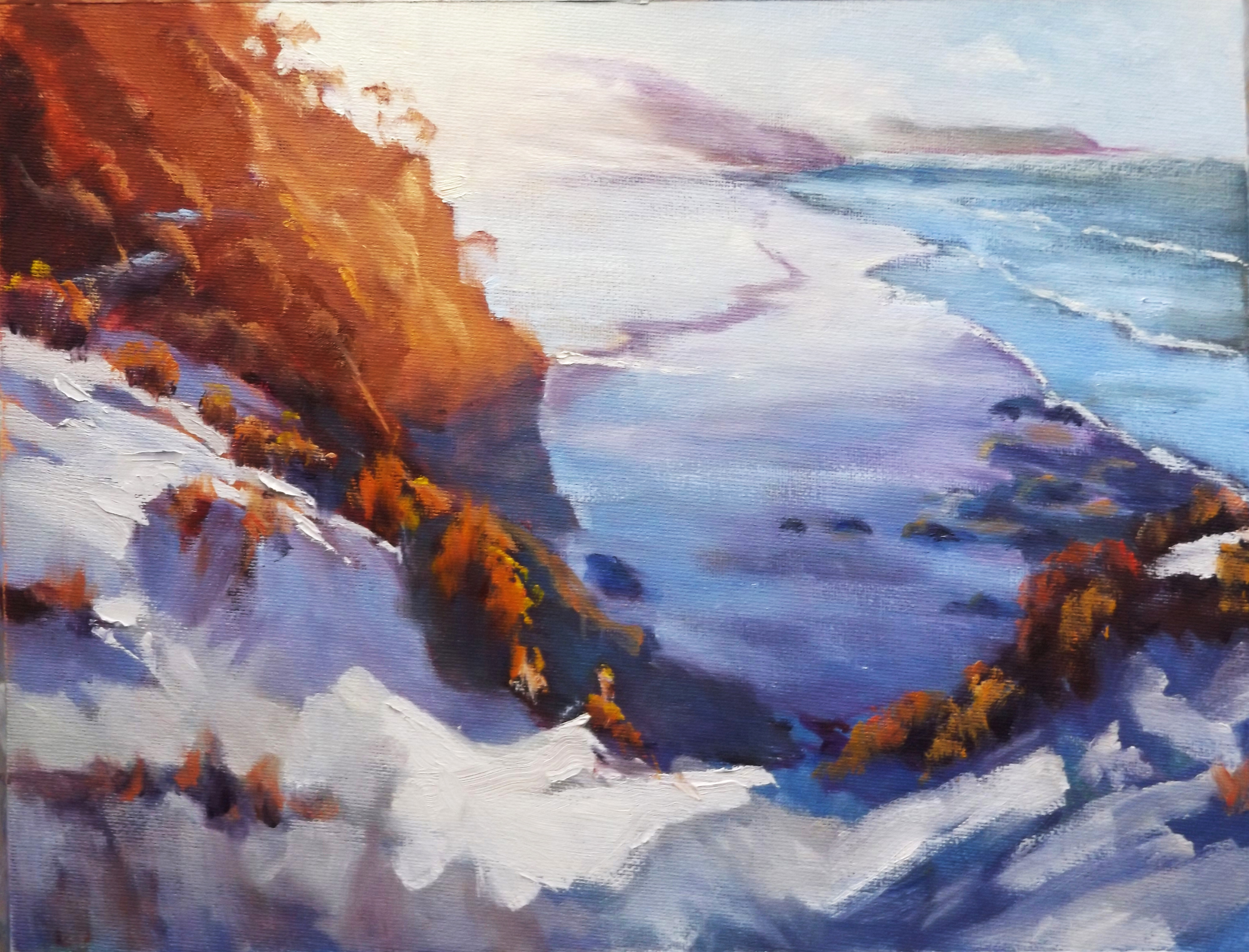 Hi Denis, there's a lot working really well in this painting with just a wee adjustment needed to turn it into a real cracker. Your drawing is spot on, your shapes are nicely designed and the values are mostly perfect AND the brushwork is beautifully succinct. However... all that beautiful warmth in the hillside is not apparent enough in the background, which is looking chalky with too much white. When painting the hills back there start with a warm colour first like a light gray yellow ochre, then go from there, injecting warmth into the sky too and reflecting it in the beach and shallow water. THEN you'll have a complete glowing effect. Beware those light diagonal sand shapes in the foreground that are creating a pattern of similar shapes. I would love to see this painting with those few changes made as I think it'll be outstanding. Great work Denis.