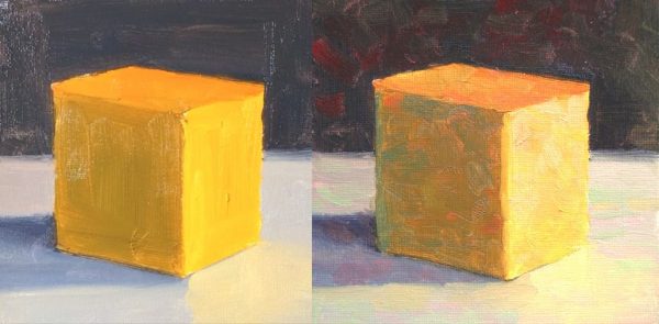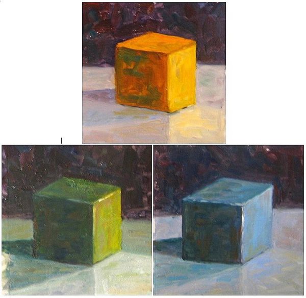 “Workshop 31 three color study†Oil on Panel 6×6″ Each by Xiao Li
