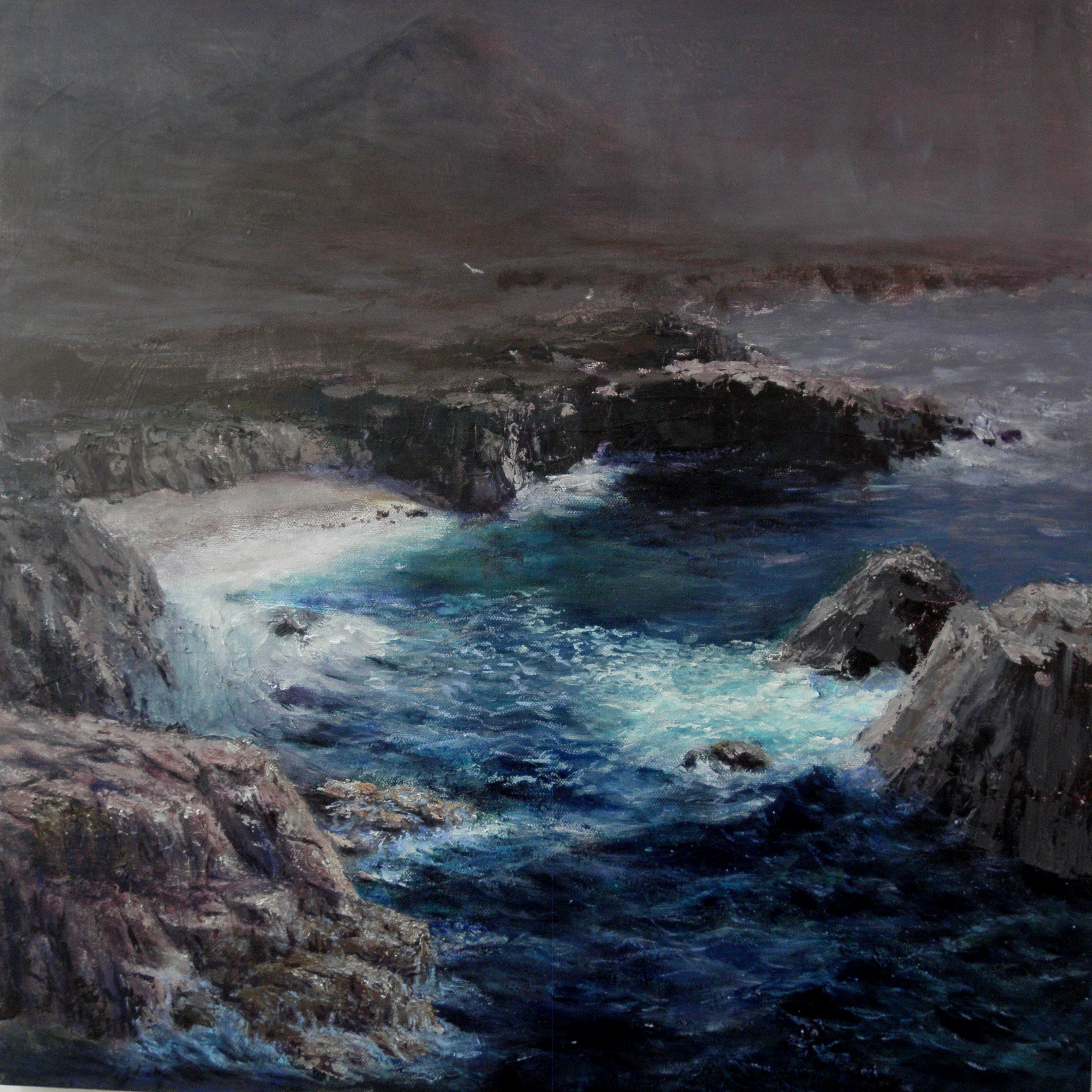 A very dramatic painting Guðmundur! You've really taken the idea of contrasting colour against grey and made a powerful statement with it. My brain is saying 'it should have slightly more colour in the top third' and that might lend it some more realism in terms of a recognisable weather/lighting effect, but then again, with that forboding ashen greyness you've given the painting such mystery that it's enticing to look at and puzzle over and it certainly leaves the blue as the star of the show. Your drawing and perspective is great and the detail you've achieved in the water which the larger canvas has allowed is captivating. It's great to see you've used a range of interesting brushwork and techniques from wet in wet to impasto knife work to scumbling and glazing to build up the paint surface. Perhaps my only reservation I have would be to break the line of the base of the rock which is just skirting the bottom left corner as it seems to me to be sqeezed into the frame with not enough room to breath. I such cases I either run the rocks out of the bottom edge or push them further up the picture plane. Despite that you've done well to shadow that area enough so that it's not a big problem. Great work Guðmundur, and I bet it looks pretty striking on the wall with a spotlight on it.