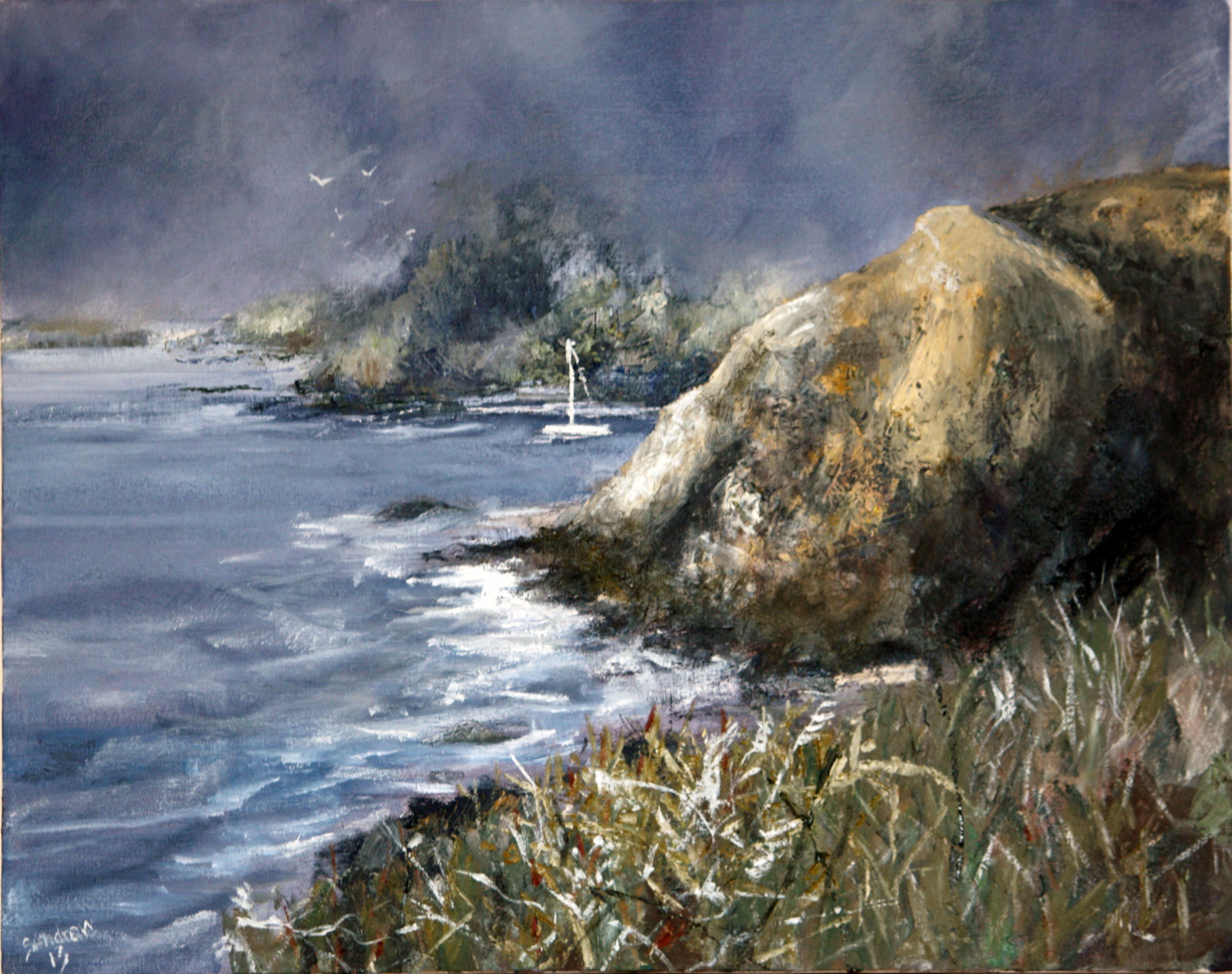 Suzanne it's great to see the extent to which you've changed the original scene to create this painting. You've made it more exciting that the photo which is always a good goal when painting from a photo. There's something so dramatic about a spotlit landscape against a dark grey background that just gets me every time and you've certainly achieved that here. You might also have tried casting the whole foreground into a soft shadow (which could still be done with glazing) to add to the lighting effect. The cliff face itself could do with a little more obvious structure - the lighter yellowish shape on top adds a dash of colour interest but the form of it is detracting from the shape of the hill rather than adding credence to it. Specifically, the large yellow shape is mostly the same colour and value which suggests flatness rather than a rounded hillside or even a broken rocky face. You've invented it yourself which is great but I feel like you've stretched beyond your understanding and need some photo resource to plan that hill a bit better. I love the energy of your brushwork in the sea foam and the rich texture you've built up in the hillsides and the whole of the background has a beautiful mystery about it. Good work Suzanne.