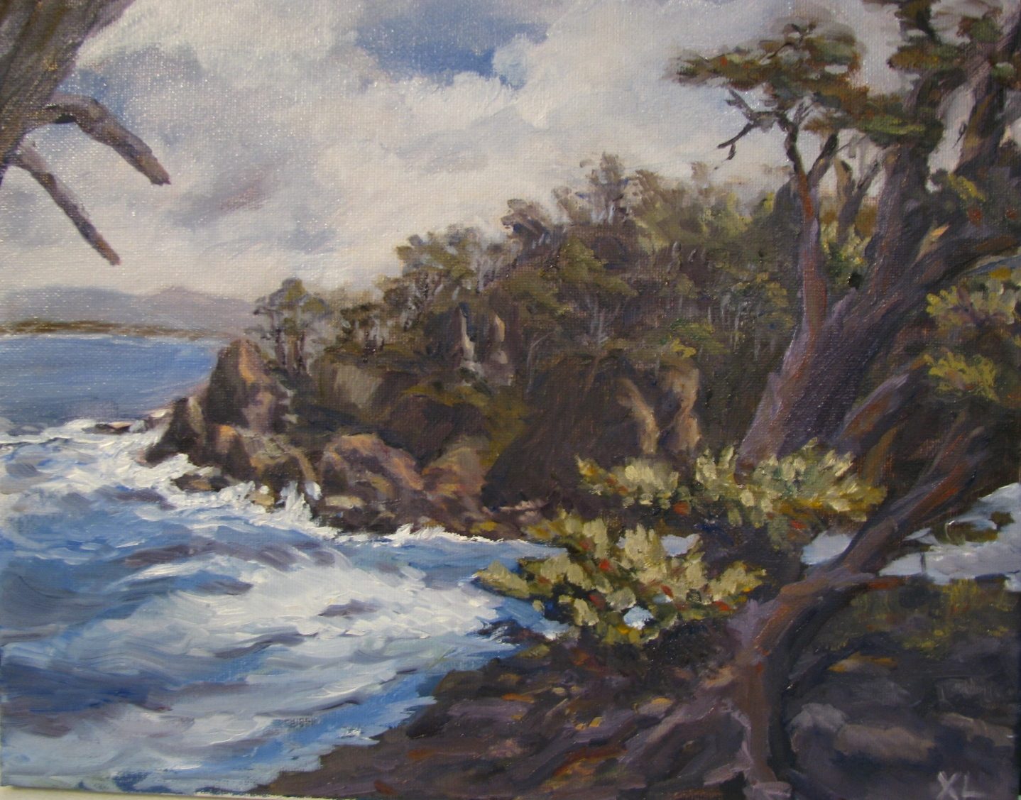 Hi Xiao, this is a good painting with a few things I'd change. First of all the good points though... nice fluid brushwork, subtle light and shadow on the water, interesting composition. Here's what I'd change - I read your comments about your battle to lighten the landscape and push it back in space and you're right you haven't quite achieved it, but being aware of the problem is the first step to fixing it. Check out the painting of point lobos I did below. There's a bigger value difference between the foreground and the mid ground than in your painting and I've especially lightened the background behind the tree which is my centre of interest. In your painting, to establish the more distinct value difference I would have first of all laid down the darkest dark in the foreground and then the darkest dark in the midground. That makes it easy to make value choices from there on in. Behind your tree I would have lightened the background even more, thinking of light through seaspray. Otherwise it's all good and the only other thing I would change is the shape of the branches in the top left because they're too similar.