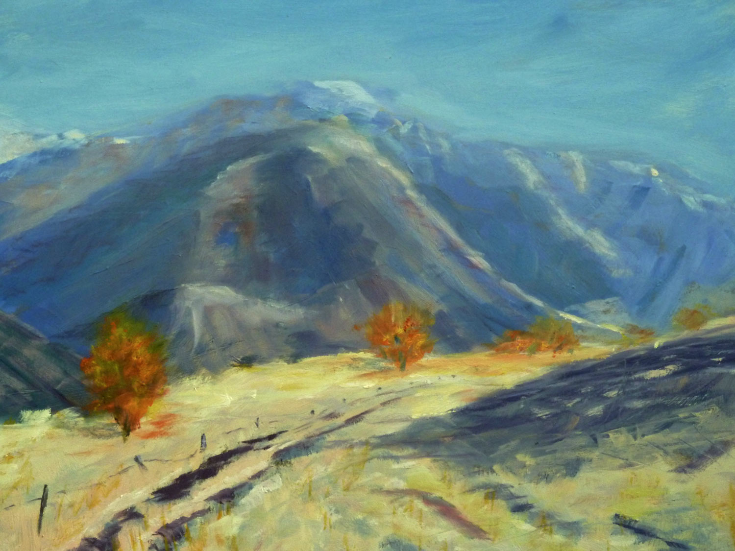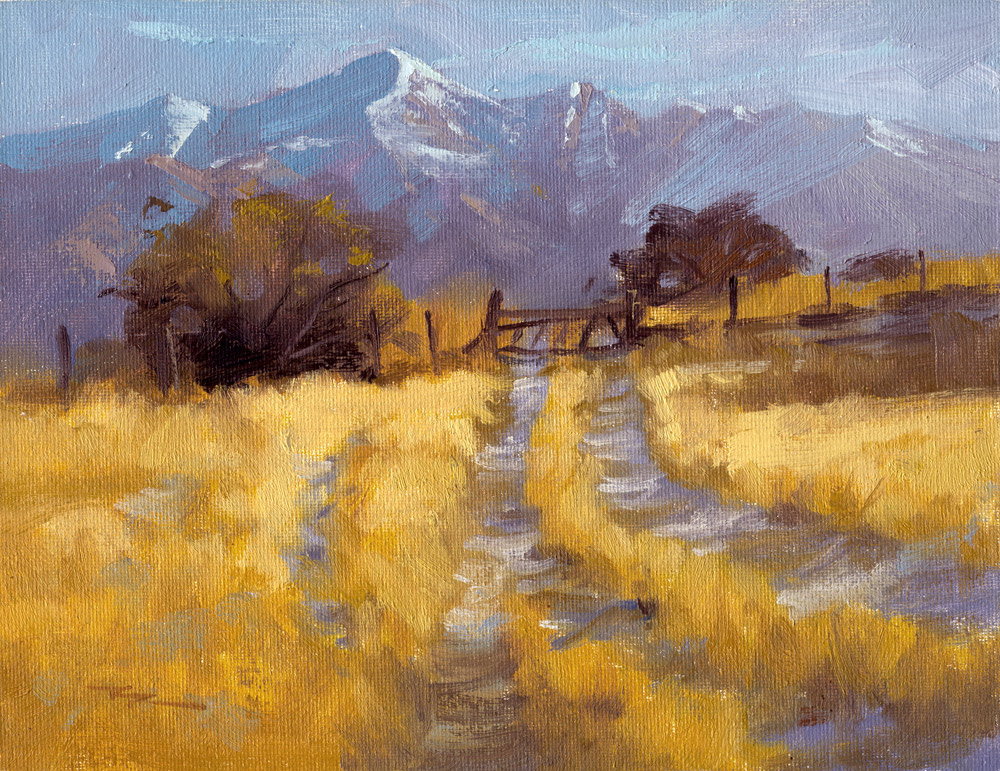 Sharron you've made a very strong painting here. The colours are very strong and that's testament to using strong colour versus grayed colour. That yellow grass is really alive with colour and light, thanks largely to the strong gray shadows you've cast on the icy track and your attention to the strength of the colour in the halftones. You've also managed to convey a slight soft shadow across the foreground which was one of the tricker parts of this scene. You could add to that with some thin glazing of alizarine crimson if you wished to enhance what you've already painted alla prima. The only two things I would personally look at changing would be the strict march of the fence line on the right and the drawing of the mountain which seems to have grown four quite similar humps, equally sized and spaced. Other than that I think it's a great painting you should be very happy with.