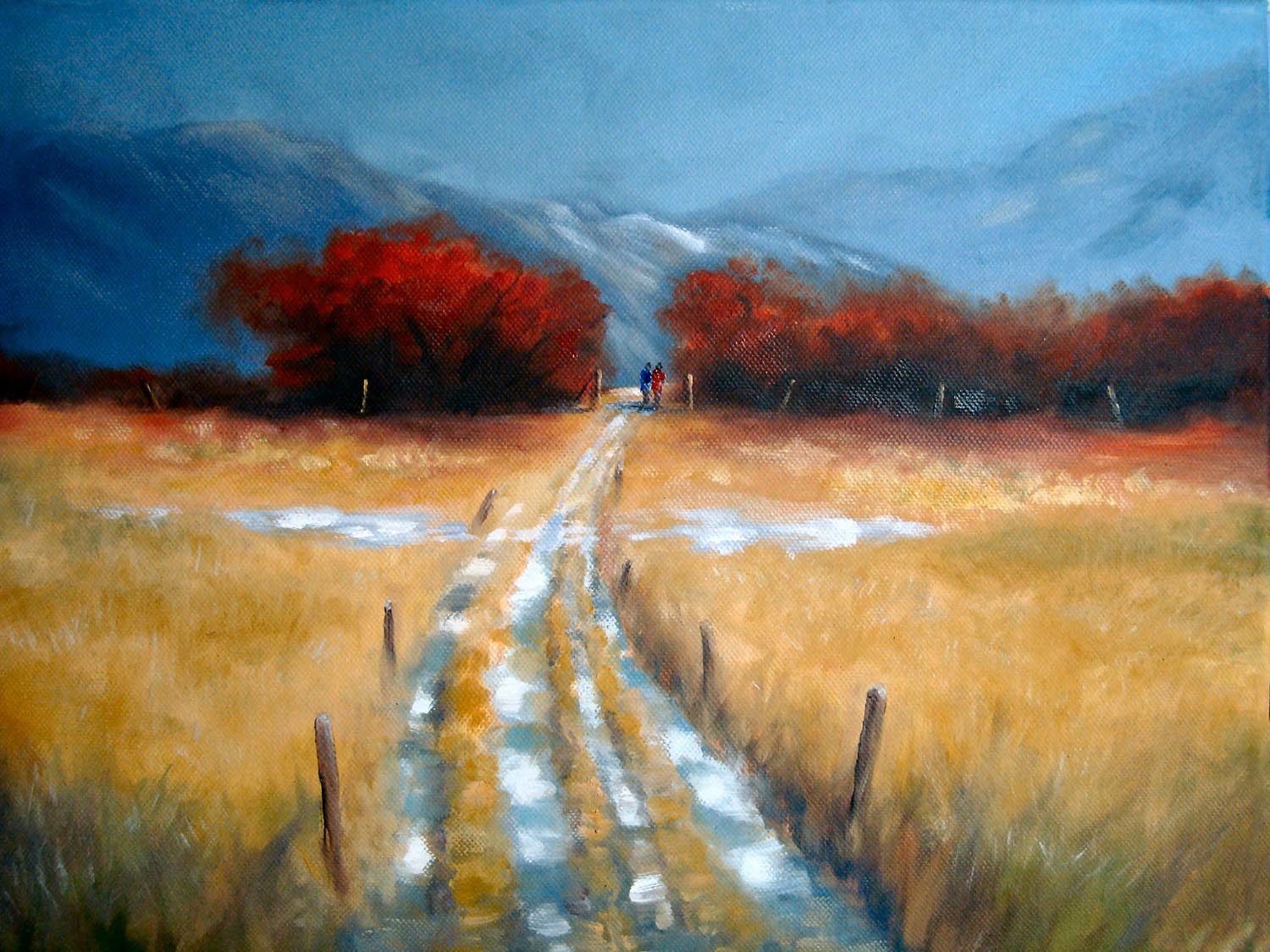 Wow, what intense colour you've made in the piece Tony! You've achieved a real read glow coming off those trees. Did you use some red glazing there as well to help there? Whatever you've done it works very powerfully against the gray-blue background. You have missed a few opportunities for exciting impasto brushwork in achieving your rich colour throughout the painting, and I would love to see if you would like to work over this one a little to experiment with a looser style, or if that might happen if you painted it again. I've painted this scene several times now and each time it frees my hand to try something a bit more daring, which I highly recommend. Your drawing of the path is very careful and you've unfortunately given in to our inclination to oversimplify and 'patternise' here - all too easy to do I know! Good that you avoid symmetry with your fence posts however they should be a fair bit thinner down the track. I do like the dash of snow you ran across the path to help loosen it up - that was a nice idea and it would work even better if you added a few subtle left side shadows to some of the grasses surrounding the snow because at the moment it's floating on top a little. Good job on keeping the values very similar and subdued in the background to which lets the foreground shine. Nice work.