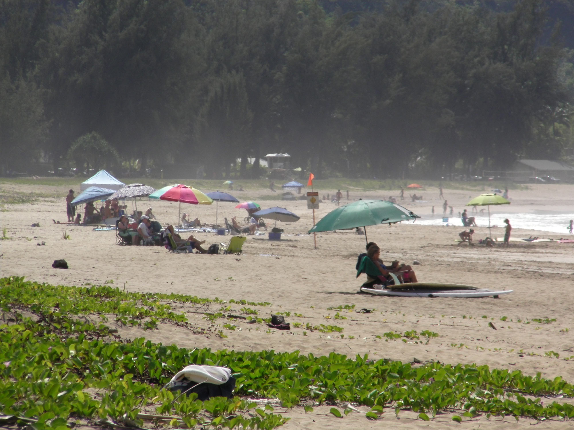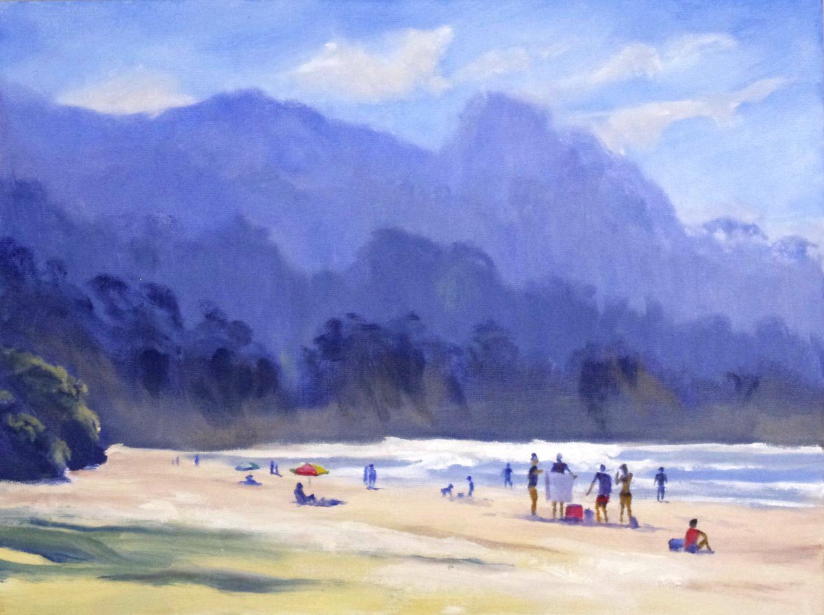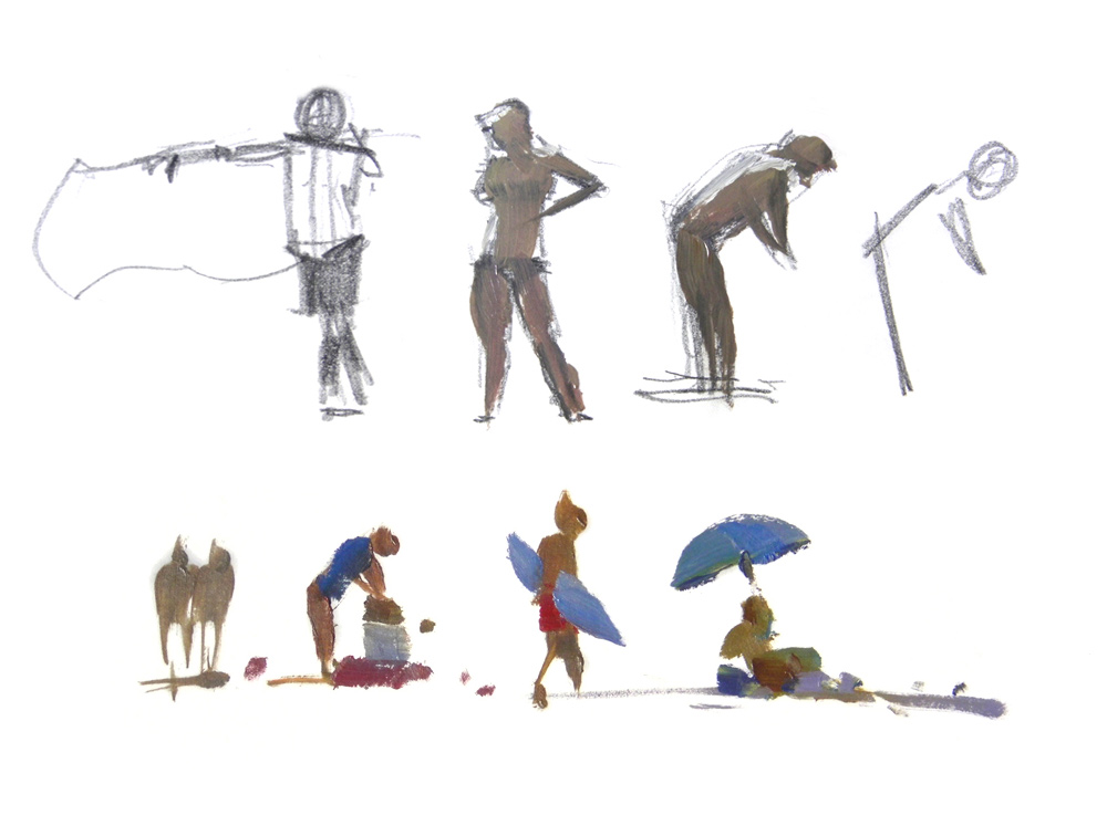 You've got a good grasp of values Sheila and your colour is good too so you've created some good distance in this painting. I would have liked to see you try getting more of that sea spray along the top of the beach to add even more distance. Your figures are great. I especially like the guy with the surfboard under the umbrella - nicely done. The intense green in the foreground is a bit of an attention grabber which pulls the eye to the edge - would have been better grayed down some. A good job overall.