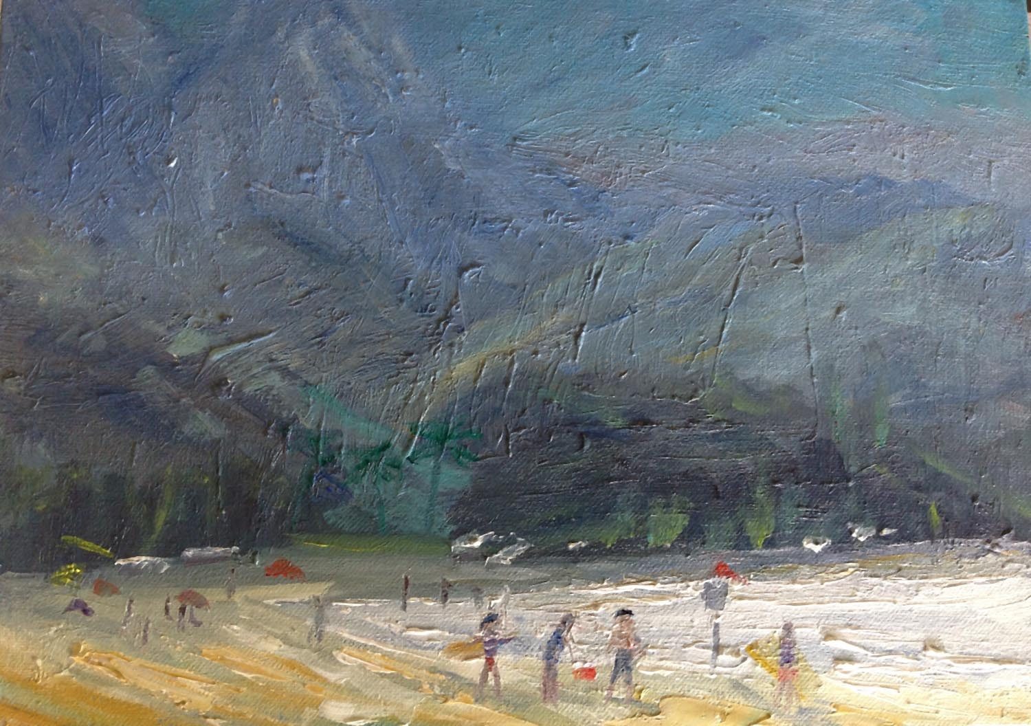 Wow very strong colour in this one Li - perhaps too strong with the background blue? It seems to jump out rather than be a backdrop. On the other hand the darker value you've got there does make for more of an imposing mountain and enhances the overall dark/light design. You figures are good too - lots of movement and nice and dark against the whitewater. A couple of those umbrellas down the beach are a bit too small - they should be slightly larger than the furthest ones. Nice fluid brushwork again - good to see. Overall a really pleasing painting.